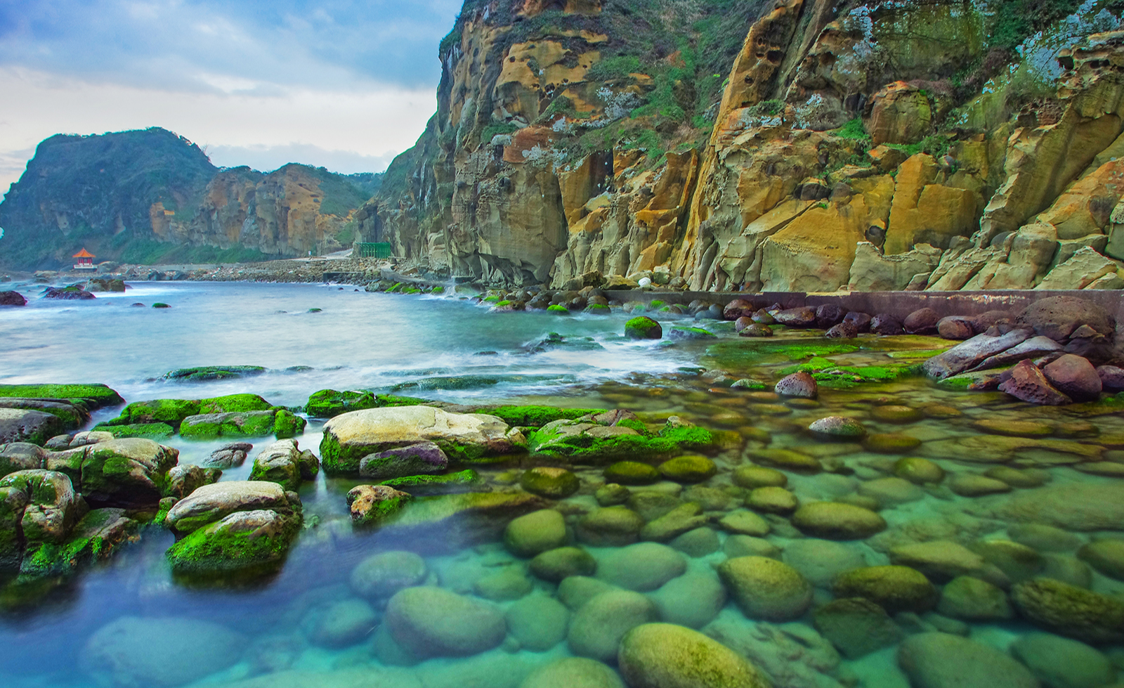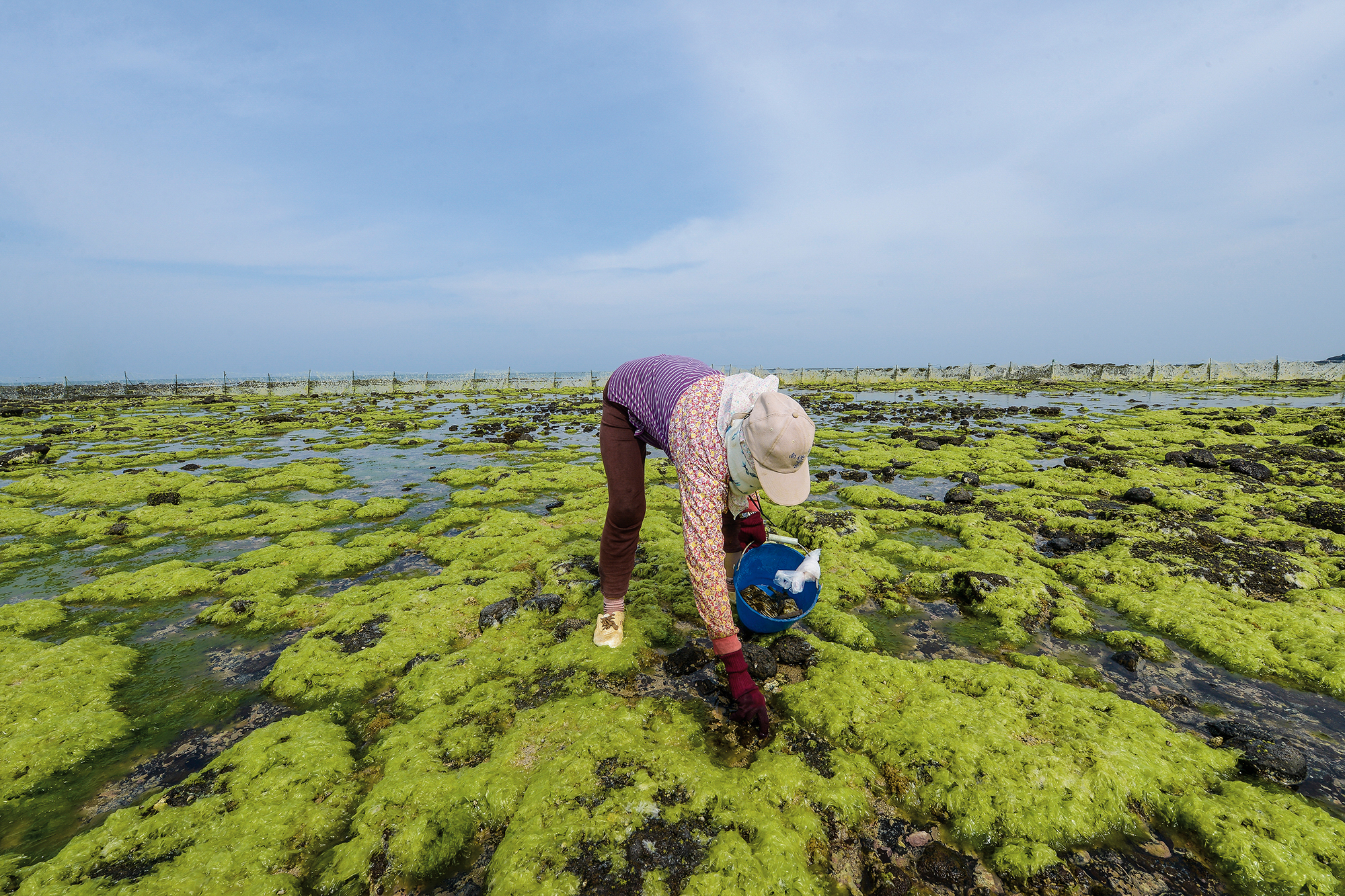南寮社區的婦女,趁著退潮之際採收依附在礁石上的海菜。