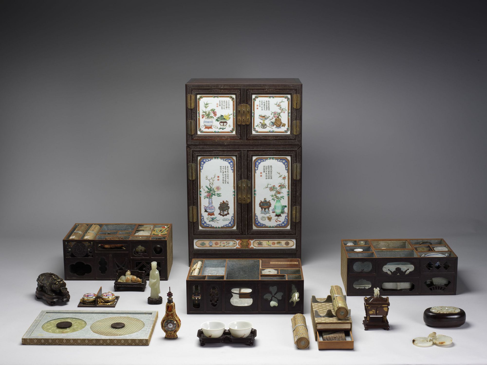 以館藏的上下兩層紫檀嵌彩瓷博古圖櫃為例,它能拆成兩個獨立收納櫃,櫃門上嵌有乾隆御製詩的瓷板畫,彷彿貼上了「皇帝御用」的標籤。櫃中收藏包羅萬象:從中原的書畫、銅器、玉器,到東洋漆盒、西洋懷錶,展現出中西兼容的收藏視野。