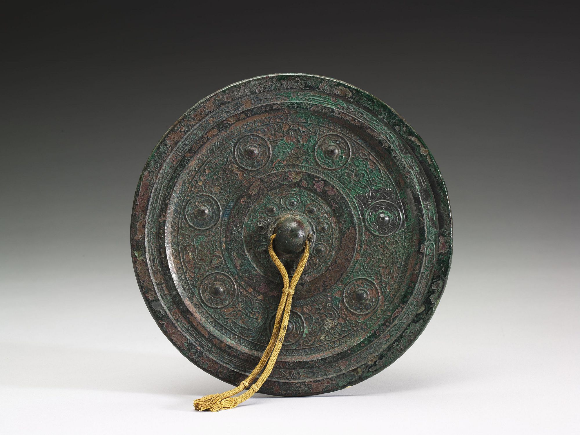乾隆皇帝酷愛珍稀古物,在他編纂的《古銅器圖譜》中,收錄了五面透光鏡。國立故宮博物院收藏的西漢晚期「宜子孫」七乳透光鏡便是其中之一。鏡背外圈排列七個圓座乳丁,間飾飛鳥、走獸與羽人,並刻有十九字銘文:「努力治事,日給月異。終身順護,至恭必富。宜子孫。」寓意自勉修身,祈求富貴與子孫昌盛。