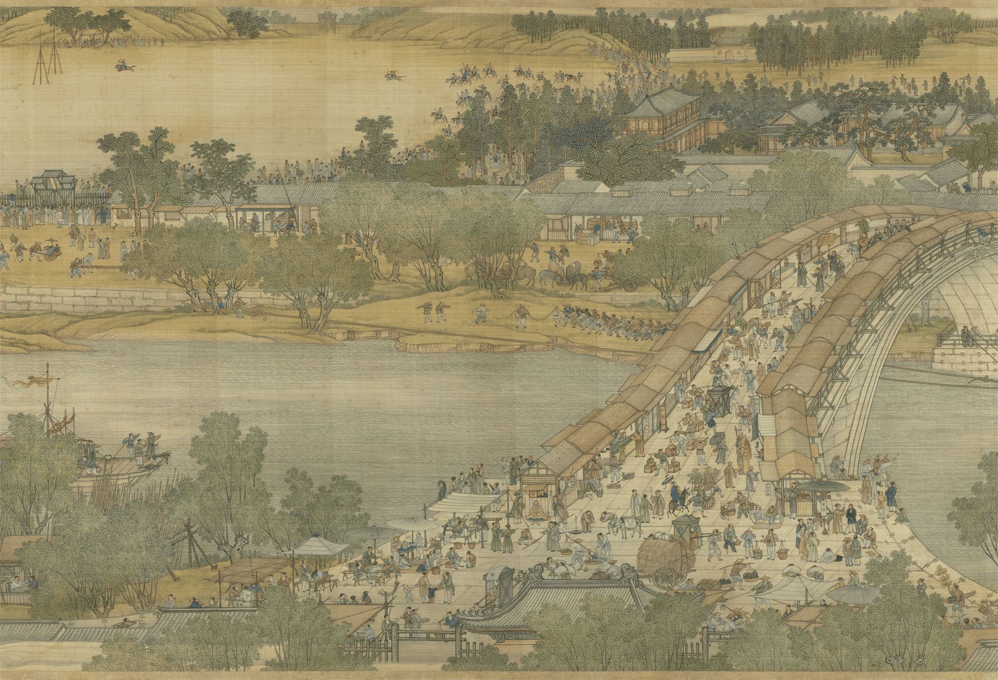 宋代張擇端的〈清明上河圖〉(北京故宮博物院藏)是寫實風俗畫的巔峰之作,描繪北宋汴京春日的熱鬧景象。長卷以河岸展開,跨虹橋連接兩岸,河道與街市上舟船、騾車、牛車穿梭運送貨物;沿街店鋪林立、攤販雲集,人群忙碌卻充滿活力。