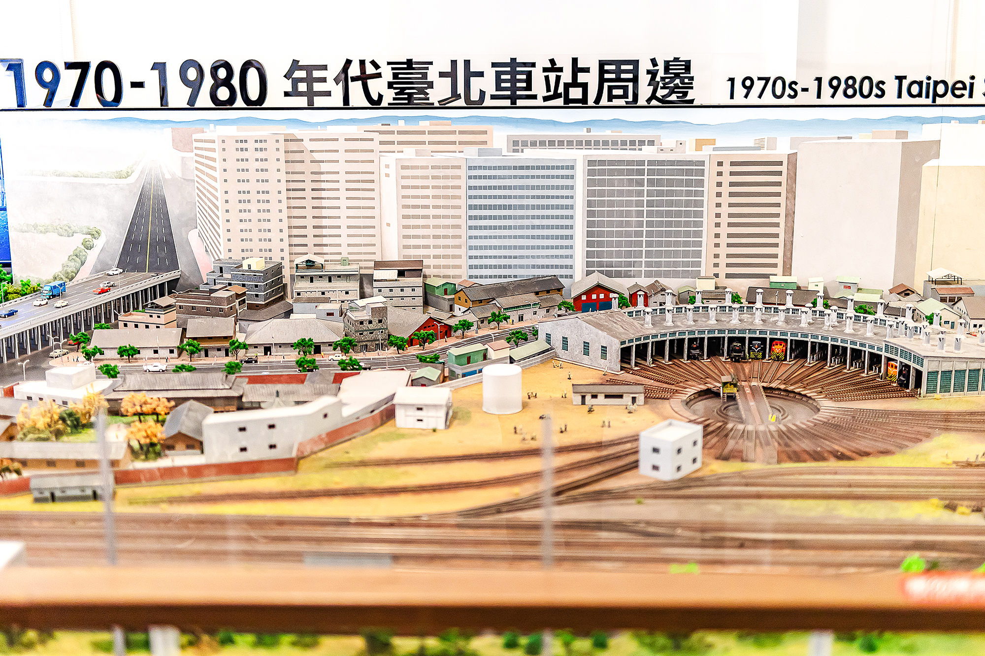 整個展區其實融貫了20世紀台北車站周邊的城景,有台灣第一座扇形車庫,偌大的站前公車月台,以及中華商場及天橋等。這些早已消失的歷史場景,除了讓老台北人會心一笑,跟著軌道往來運行的列車,在引人驚嘆之餘,召喚起所有人的生活共感。