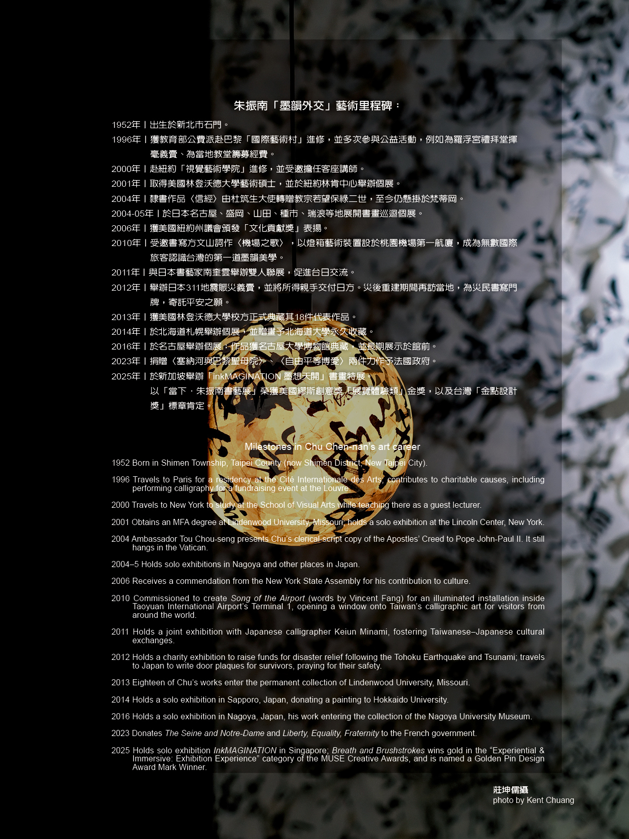 2025年在桃園橫山書法藝術館舉辦的「當下‧朱振南書藝展」,展出近60件作品,包括跨界代表作〈機場之歌〉、為母親而寫的〈心經〉、完成於法國的18公尺長卷〈道德經〉,以及將不完美的練習草稿撕裂、重組、堆疊而成的〈吉光.片羽〉,展現他從傳統出發,歷經異文化洗禮,最終回到書寫本質的當代重構。