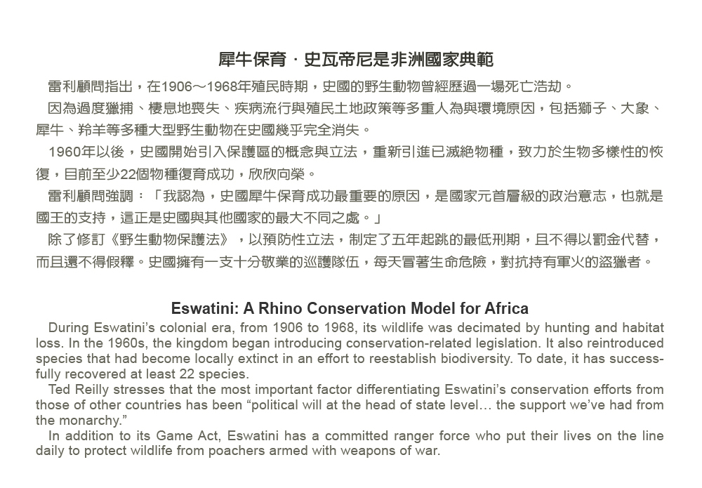 史國對犀牛的保育可以說是非洲國家的典範,雷利顧問十分自傲地說:「史國擁有非洲國家最成功的保育紀錄,近30年來,史國只有三頭犀牛因盜獵而死亡,但鄰國盜獵猖狂,加上地廣人稀,難以防範,平均每天損失三頭犀牛。」