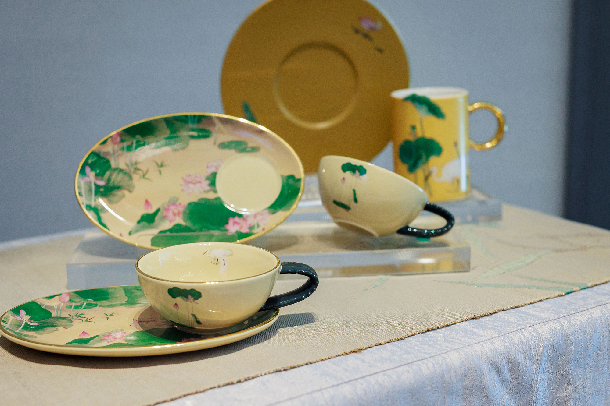 林玉山的〈蓮池〉獲文化部指定為國寶十週年,國美館打造聯名瓷器,實踐「藝術走進生活」的理念。(國美館提供)