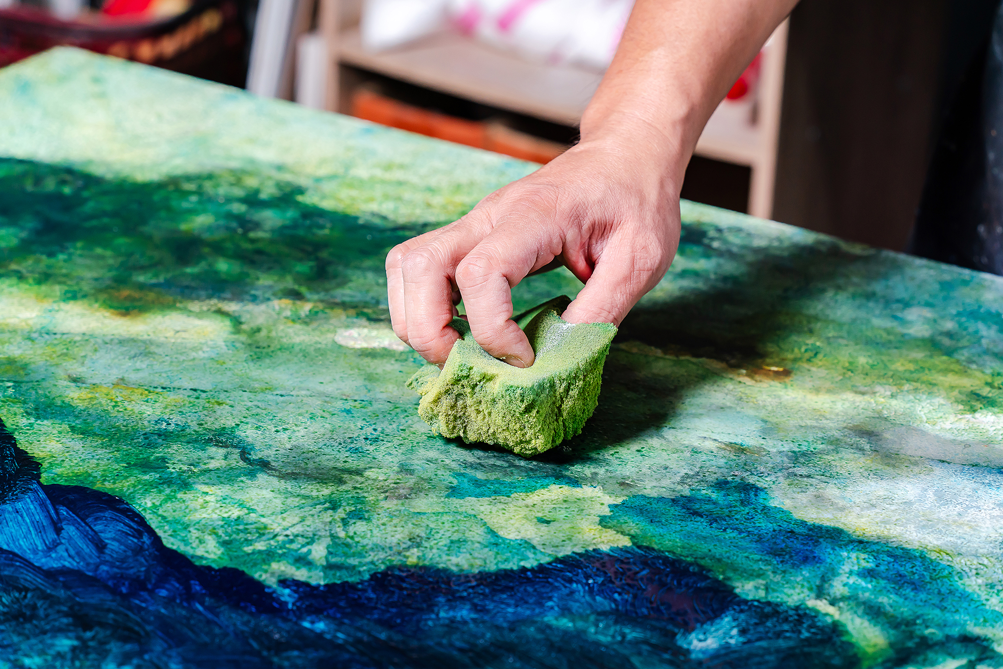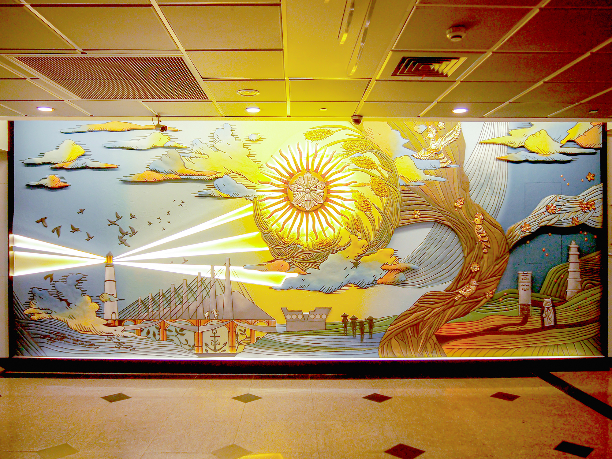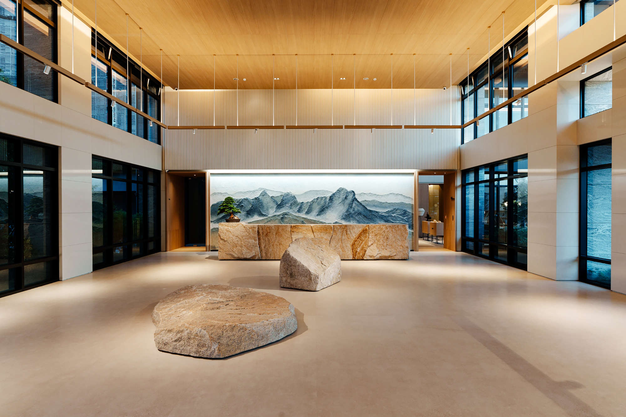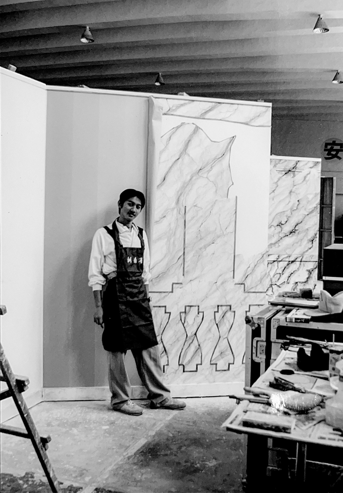 陳協建讓漆作不只是基礎裝潢,而能結合藝術創作,營造空間氛圍。圖為陳協建受建設公司邀請,以玉山為靈感的創作。(磐興建設提供)