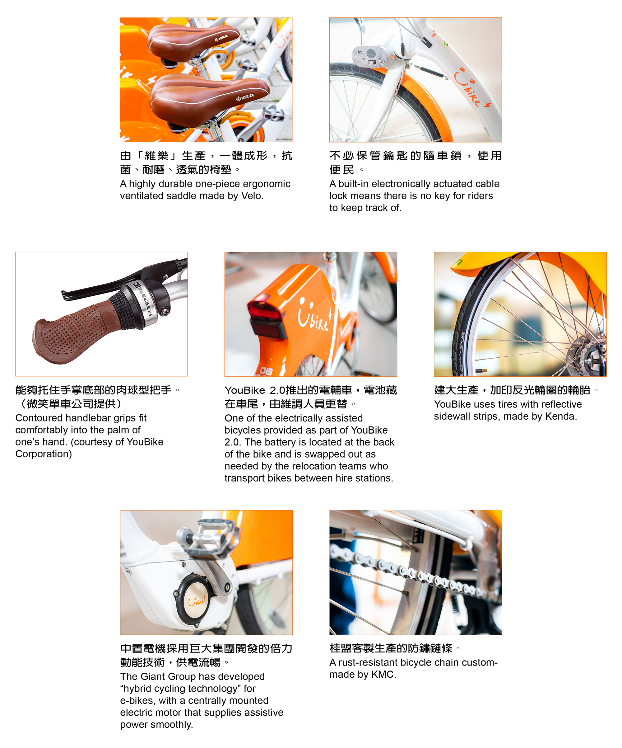 YouBike車身使用的零組件,不乏執產業牛耳的台灣之光。如:成本為一般鍊條的數倍,由全球最大鏈條廠商「桂盟」生產的鏈條;由Tesla汽車椅墊製造商「維樂」生產,強調一體成型、透氣的椅墊;以及「建大」生產的輪胎,配方及製程都經過客製化調整,並額外加印反光輪圈。