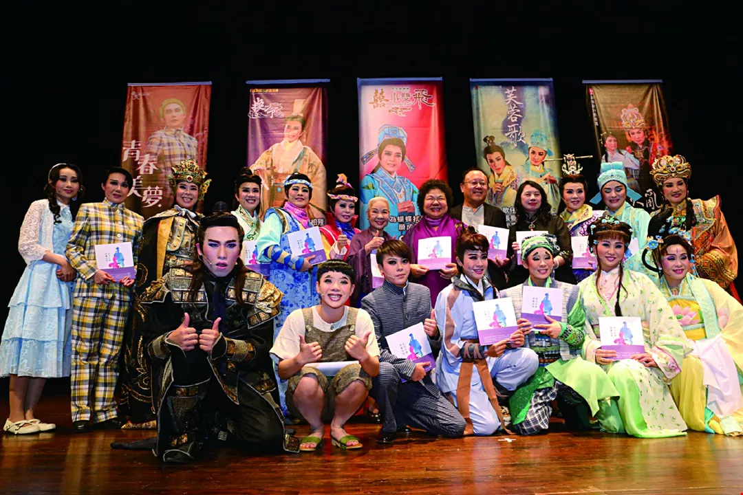 伝統芸術を奨励する高雄市の陳菊市長(後列右から6人目)と史哲文化局長(後列右から5人目)。高雄庄頭芸術フェスティバルで公演した歌仔戯団とともに。 (高雄市文化局提供)