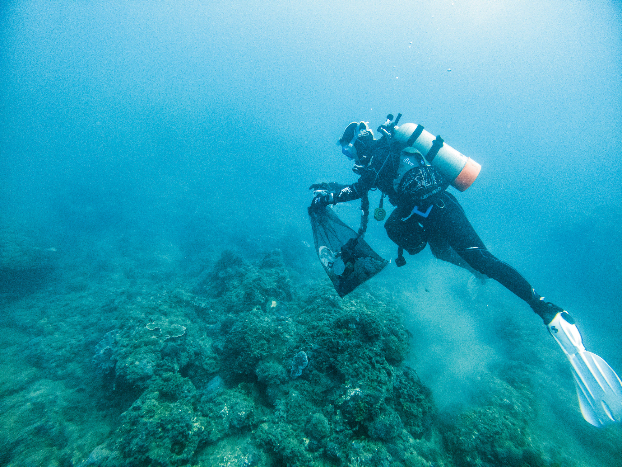 「着任して間もない頃、スタッフを率いてロープで大尖山に登り、たくさんのゴミを拾いました」と陳栄祥は言う。当時、大尖山への登山は禁止されておらず、墾丁を訪れる観光客に人気のコースの一つだった。「山の清掃が終わると、次は海辺の岩礁のゴミを拾い、その後は海に潜って海底のゴミを集めました」と言う。