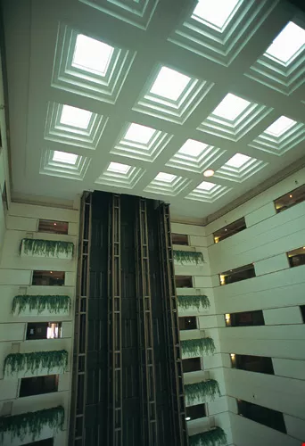 新竹の国賓飯店では空調と照明をコントロールすることでエネルギー費を売上の5.5%から3.1%に削減し、工業研究院から「省エネ優良企業」に表彰された。写真は同ホテル中央吹き抜けの採光・断熱兼防火天井である。