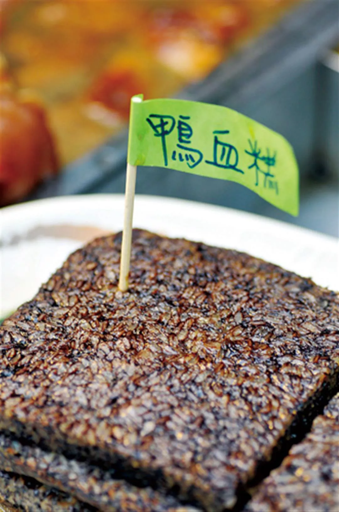アヒルの血は供給量が少なくて値が高く、鶏の血は固まりにくいため、豚の血がこれに取って代わり「猪血糕;」ができた。現在は、蒸した猪血糕;に甘辛ソースを塗り、ピーナッツ粉と香菜をまぶして食べる。