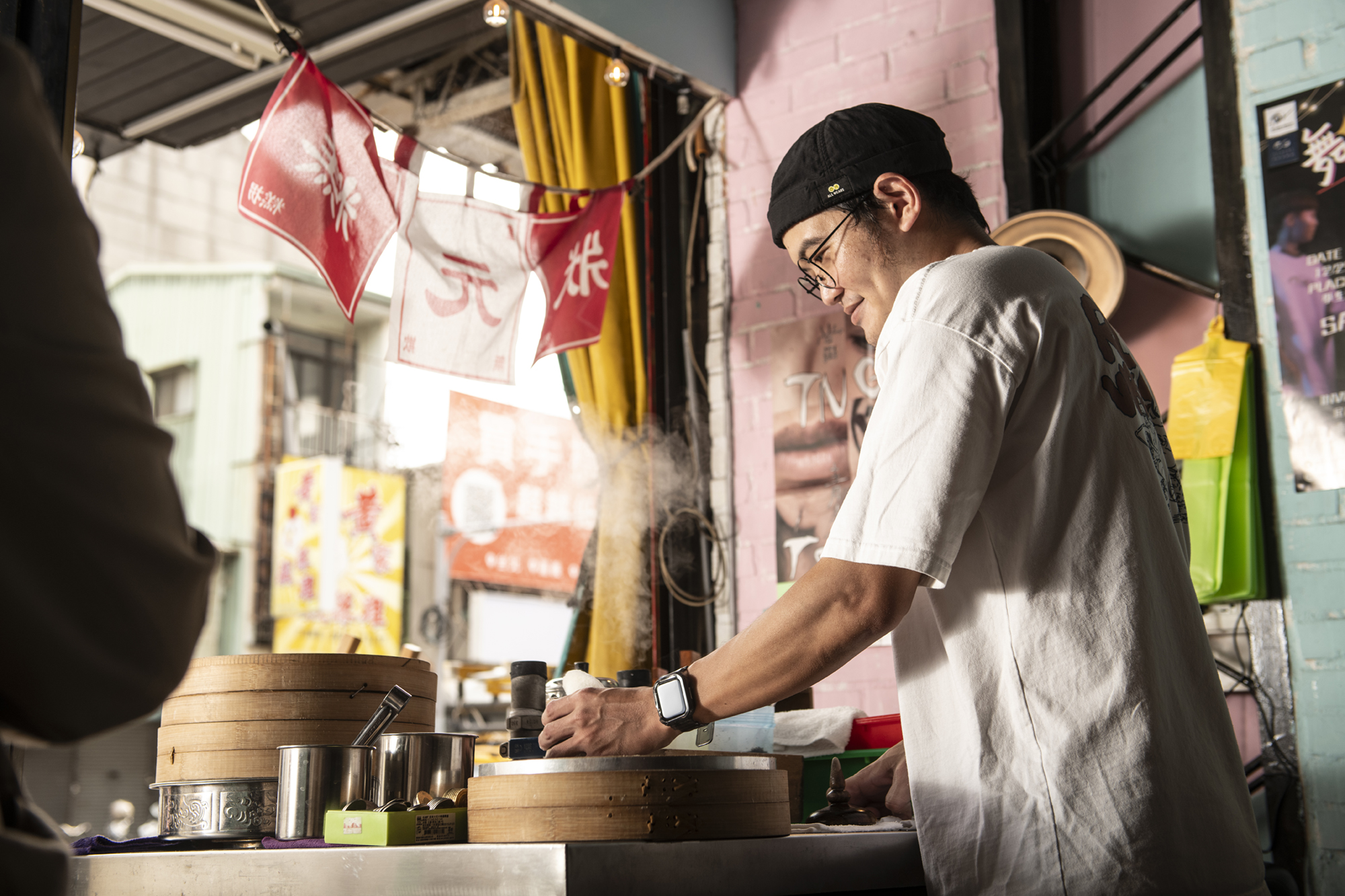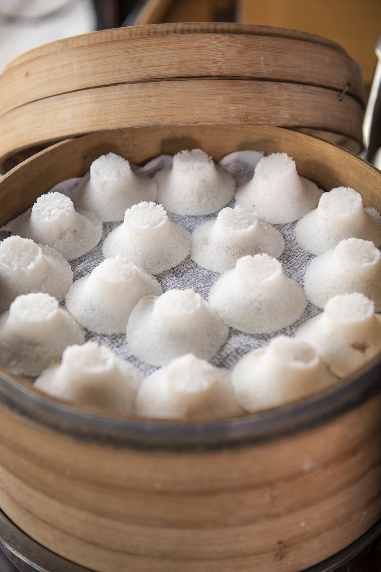 蒸気が木製の型の中に吹き込み、数十秒もすると、職人は型をひっくり返して蒸しあがった菓子を取り出す。「コンコンコン」とリズミカルにたたくと、ふかふかの白い鬆糕が現われ、米と餡のやさしい香りが立ちのぼる。