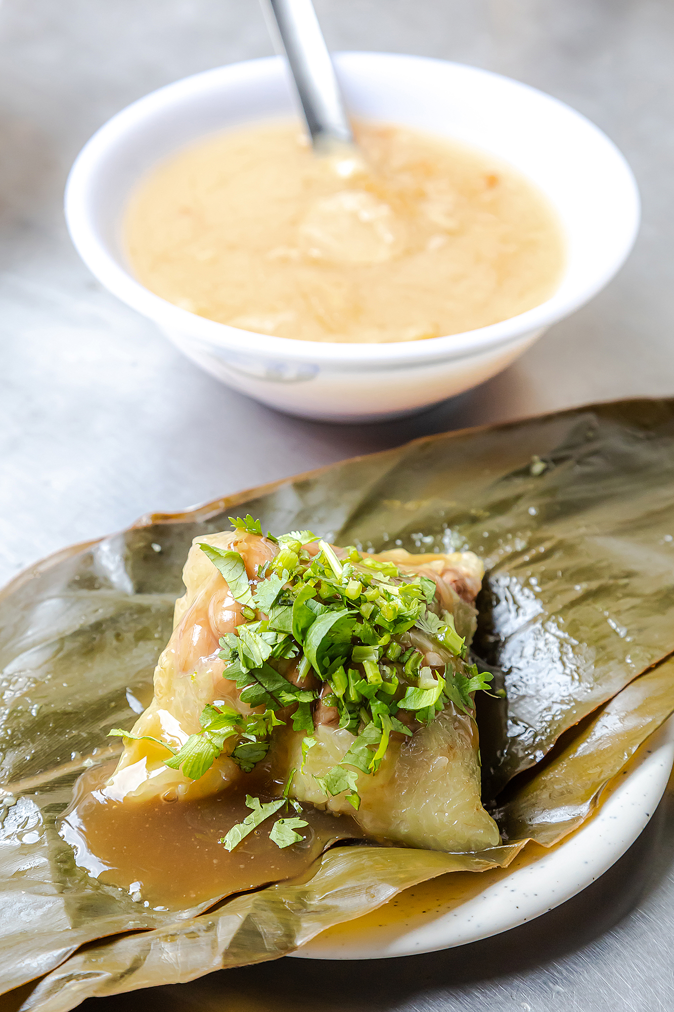 菜食ちまきは、もち米と落花生だけで作られ、ゲットウ(月桃)の葉で包まれる。落花生の粉は加えない。女将の呉珮瑧によれば、落花生の粉でゲットウの葉の香りが損なわれないようにするためだそうだ。鄭世男によれば、ゲットウの葉は伝統的な笹の葉よりも厚く、葉を洗ってから、一度茹でて柔らかくしなければならないとのことだ。「うちのちまきは、一晩かけて茹でるんです。夜10時から翌朝4時までずっと茹でるのですが、落花生に火が通り、ゲットウの葉と落花生の香りが混ざり合うまで5時間は茹でないと」と言う。