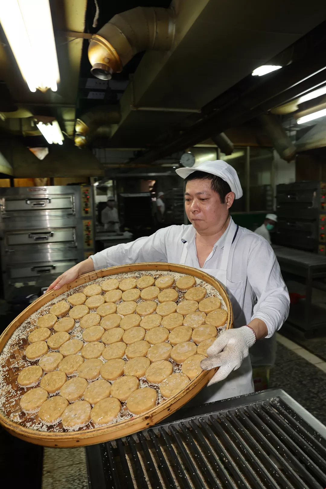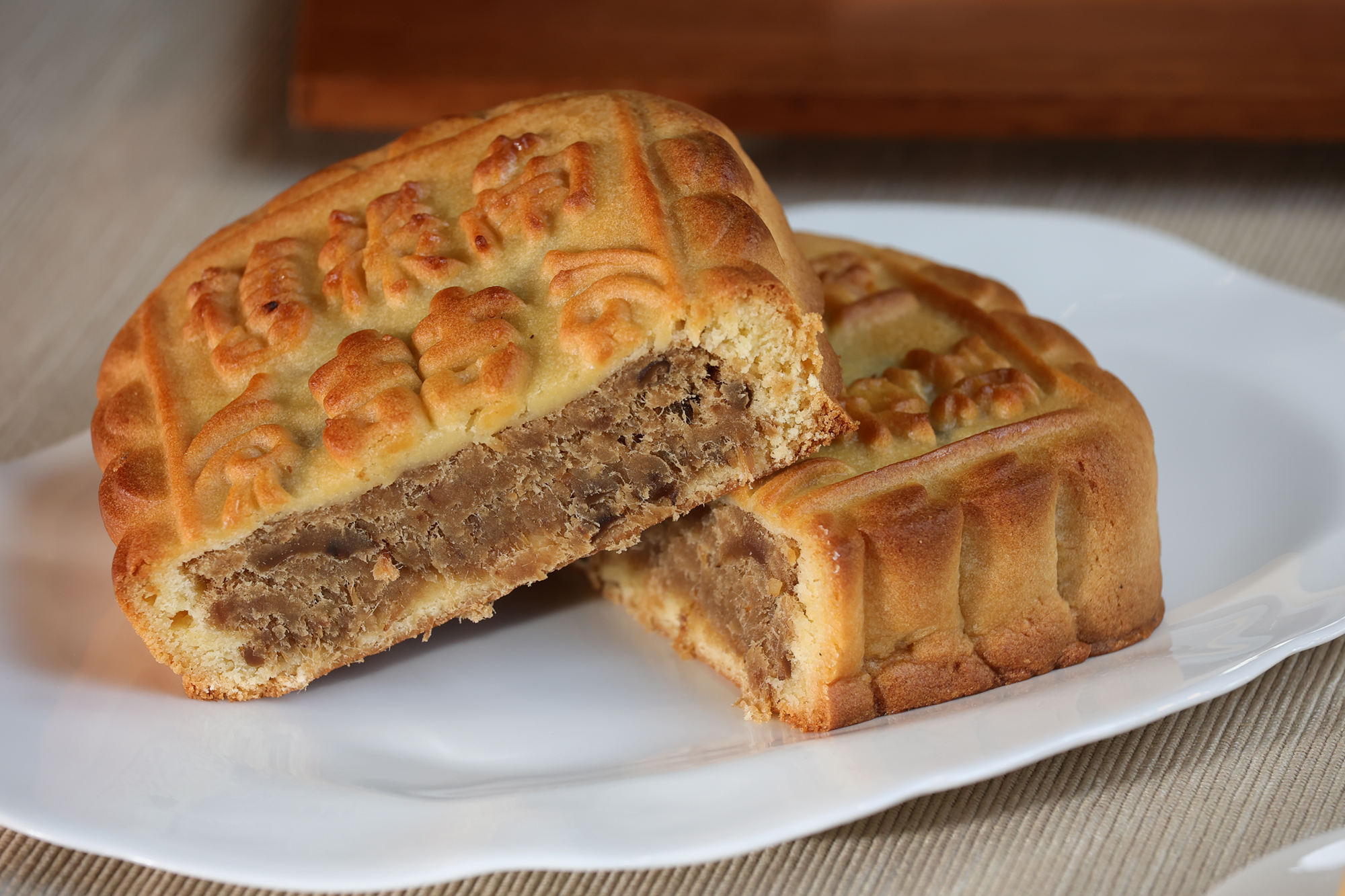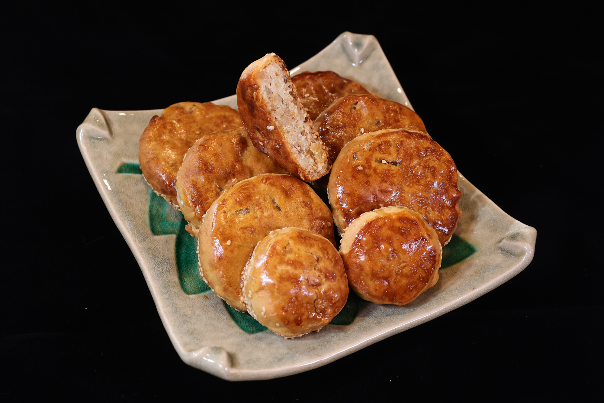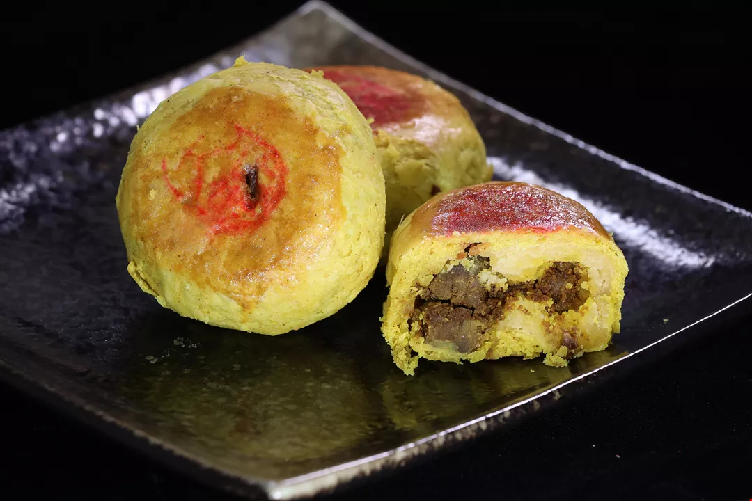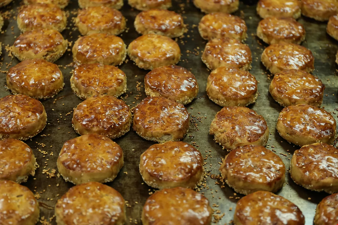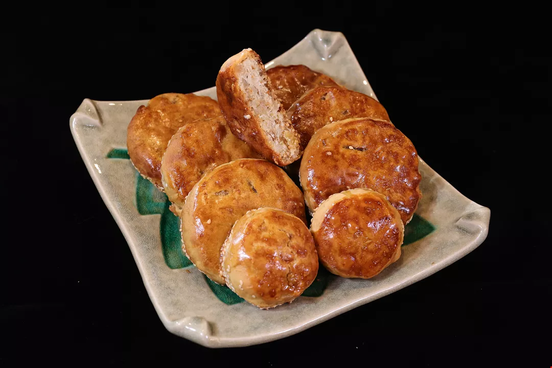 肉は赤身と脂身がほどよく混じった豚の後ろ脚のももを選ぶ。それを幾種かのタレで煮込んだり炒めたりを繰り返して肉にうま味を閉じ込める。冷ましてから緑豆餡に混ぜ込み、それをパイ皮で包む。さらに形を整え、上部に店名の朱印を押してから、その日の天候に合わせた温度にオーブンを設定して焼き上げる。
