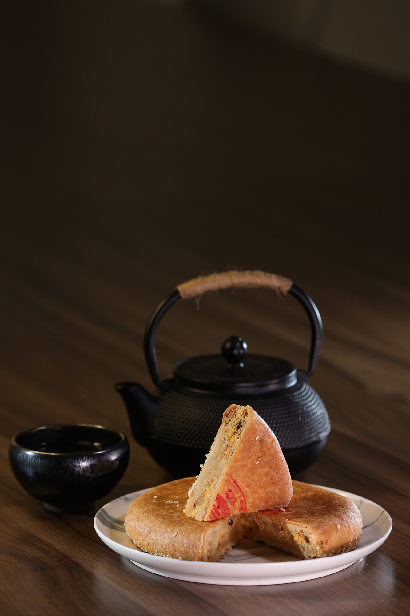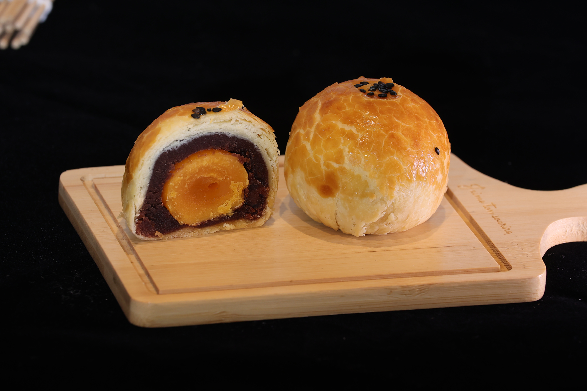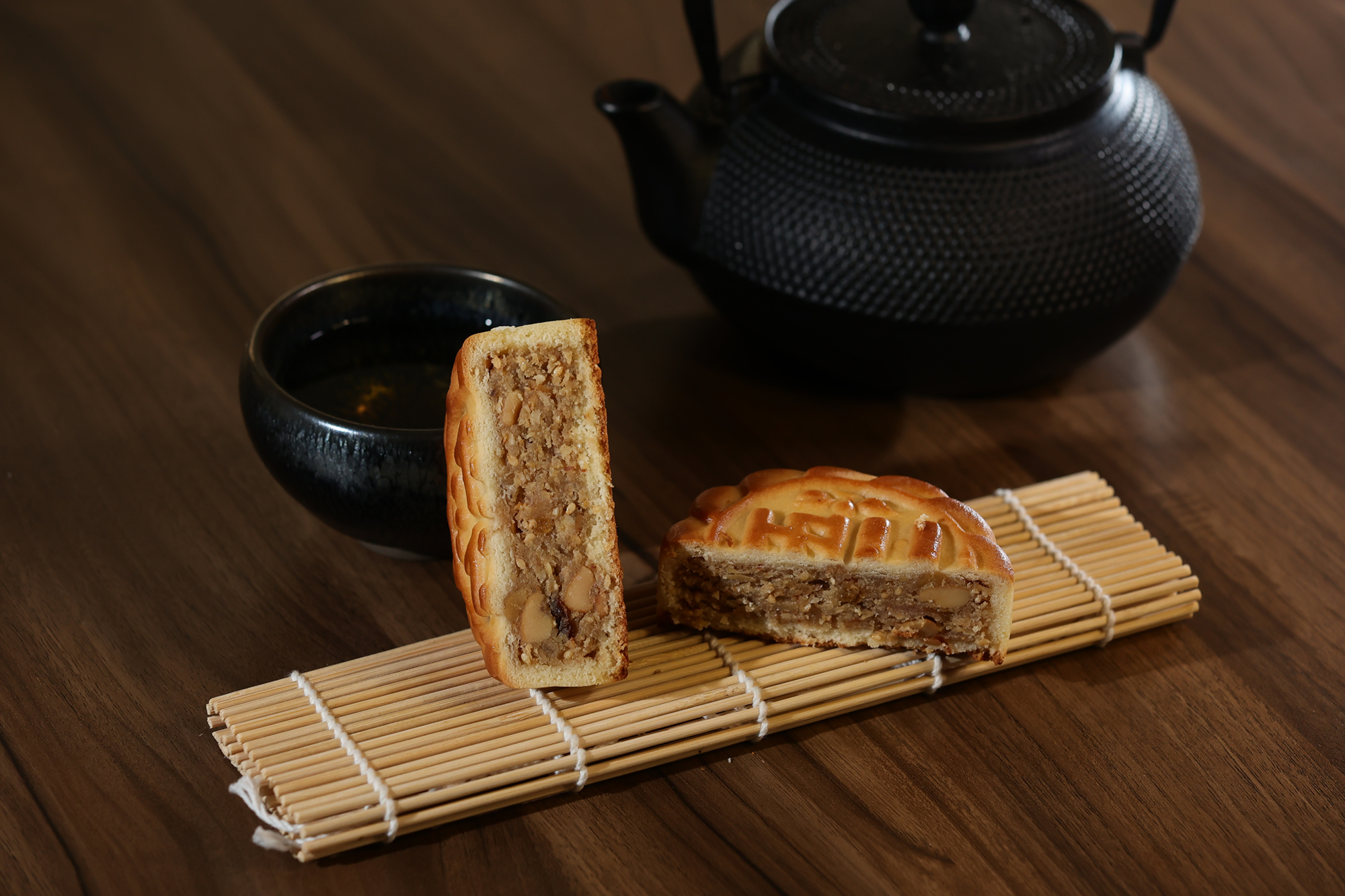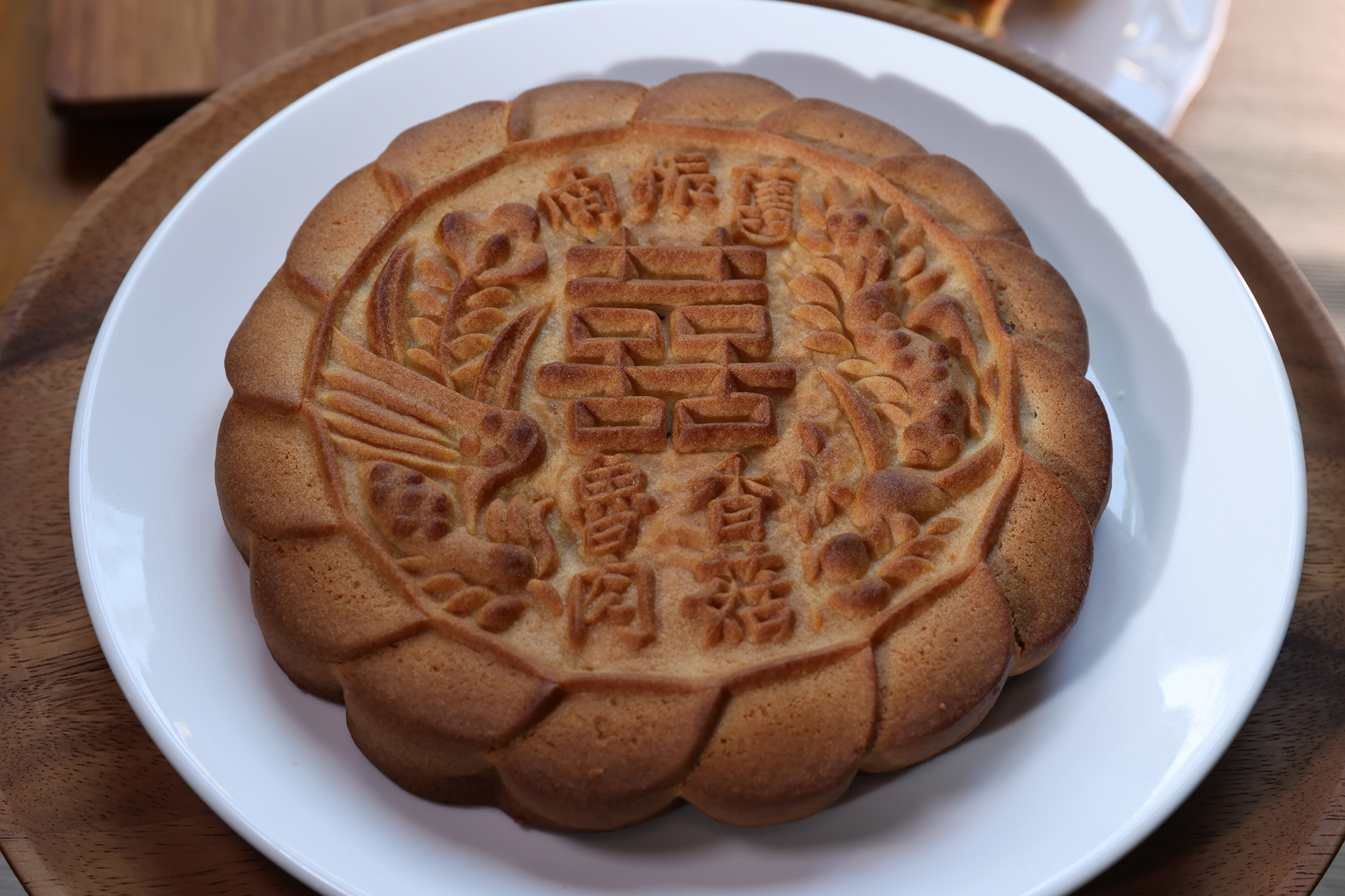 肉は赤身と脂身がほどよく混じった豚の後ろ脚のももを選ぶ。それを幾種かのタレで煮込んだり炒めたりを繰り返して肉にうま味を閉じ込める。冷ましてから緑豆餡に混ぜ込み、それをパイ皮で包む。さらに形を整え、上部に店名の朱印を押してから、その日の天候に合わせた温度にオーブンを設定して焼き上げる。