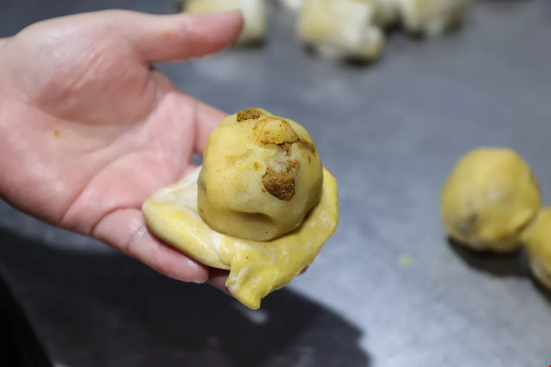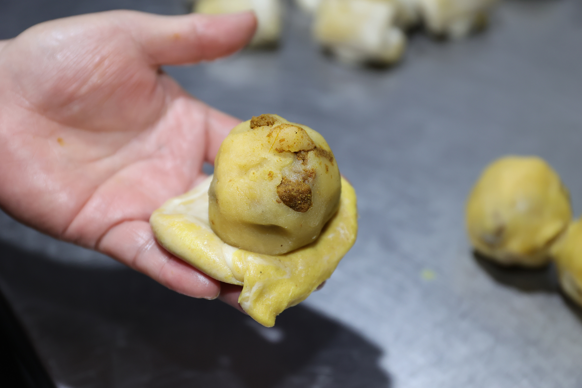 餡の多い部分をかじると緑豆の香りと甘さが強く感じられ、もう一口かじって肉の多い部分が口に入ると、餡の甘さは肉やカレーの味に隠れてしまう。まるで次々と変わる味覚のショーが繰り広げられているような感じなのだ。