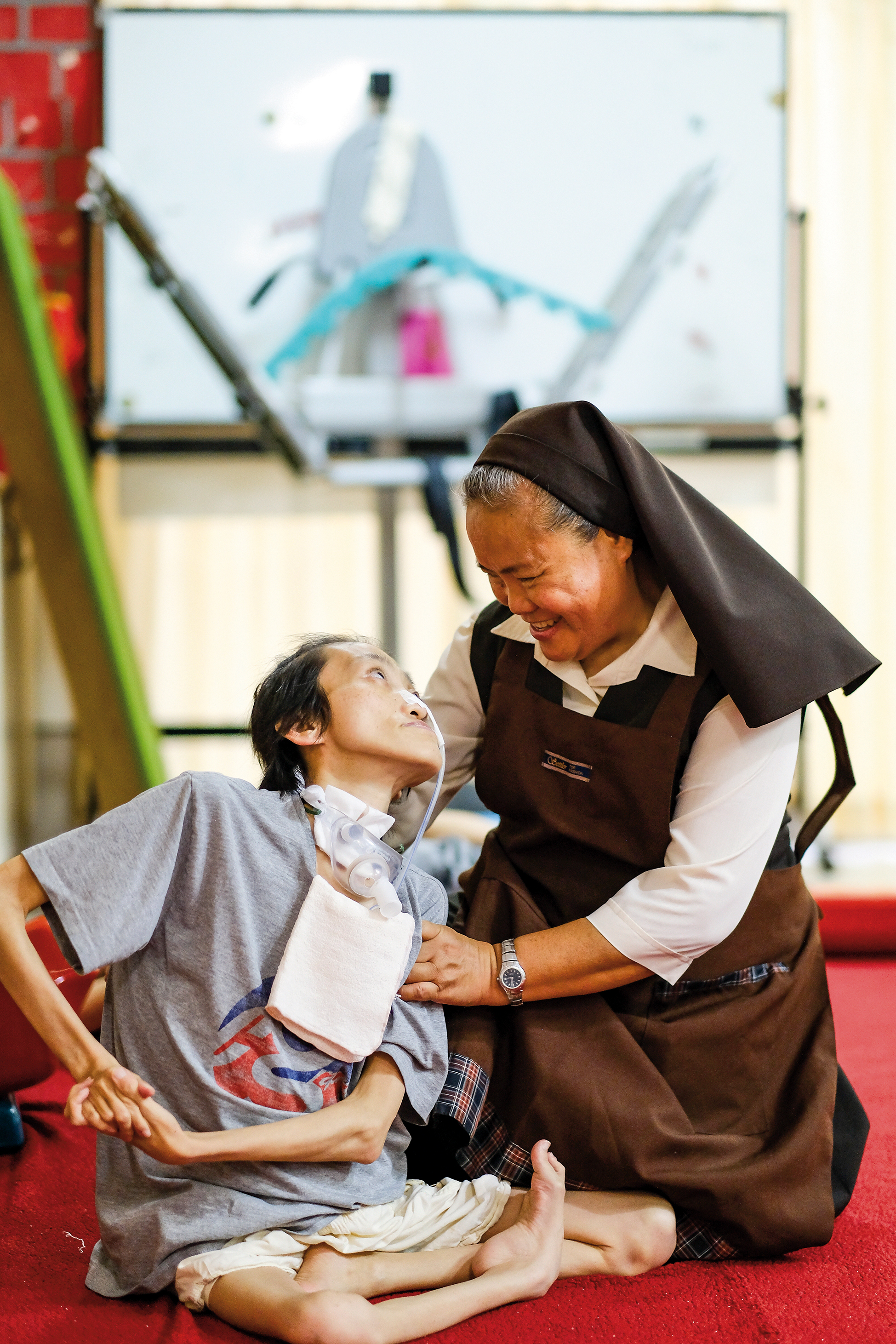 最初の頃は人手も足りず、症状が特に悪い子供もいたため、シスターは夜中でも状態を確認できるよう、彼らを自分の宿舎へ連れ帰って世話をすることもあった。24時間にわたって一緒にいると、具合が悪いかどうかや、病状の悪化も感じ取ることができるようになり、これから子供に発生することを夢に見ることもあるという。まさに母と子の心のつながりである。