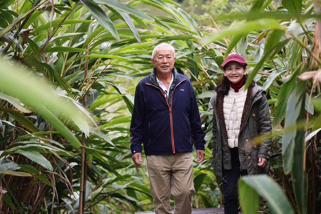 新竹県尖石郷の那羅集落でゲットウ(月桃)に関する物語を語る邱新発さん(左)と楊翠喜さん(右)。彼らの努力で集落出身の若者が故郷で新たな仕事を持てるようになった。
