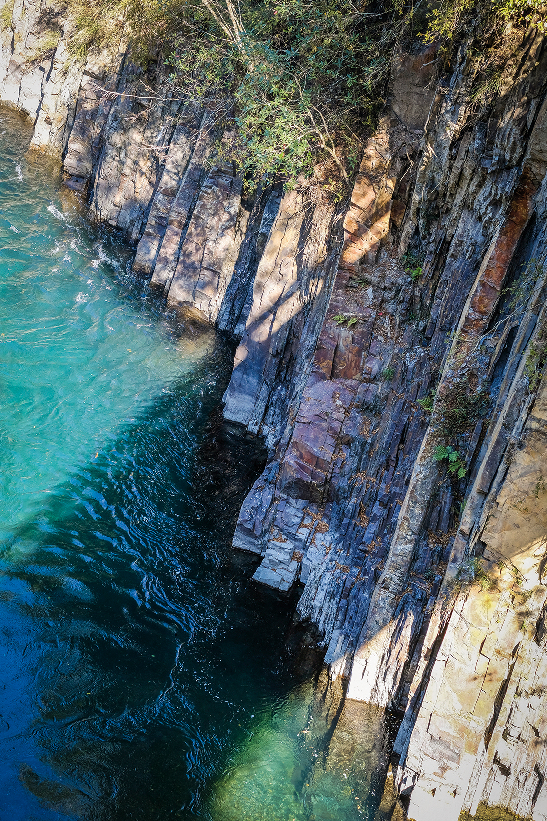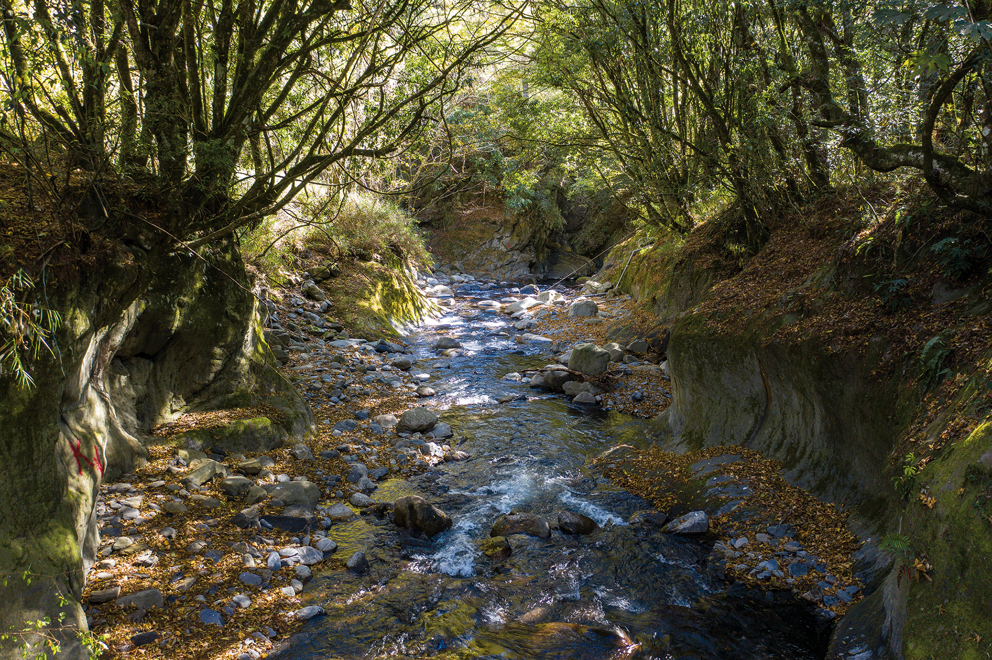 大甲渓渓谷を俯瞰するようになると玄武岩秘境は目の前だ。崖の急な小道を下って谷に下りられる。張さんは得意の口琴を鳴らし、4バージョンあるタイヤルの起源神話を聞かせてくれる。だが何より衝撃だったのは九死に一生を得た話だ。