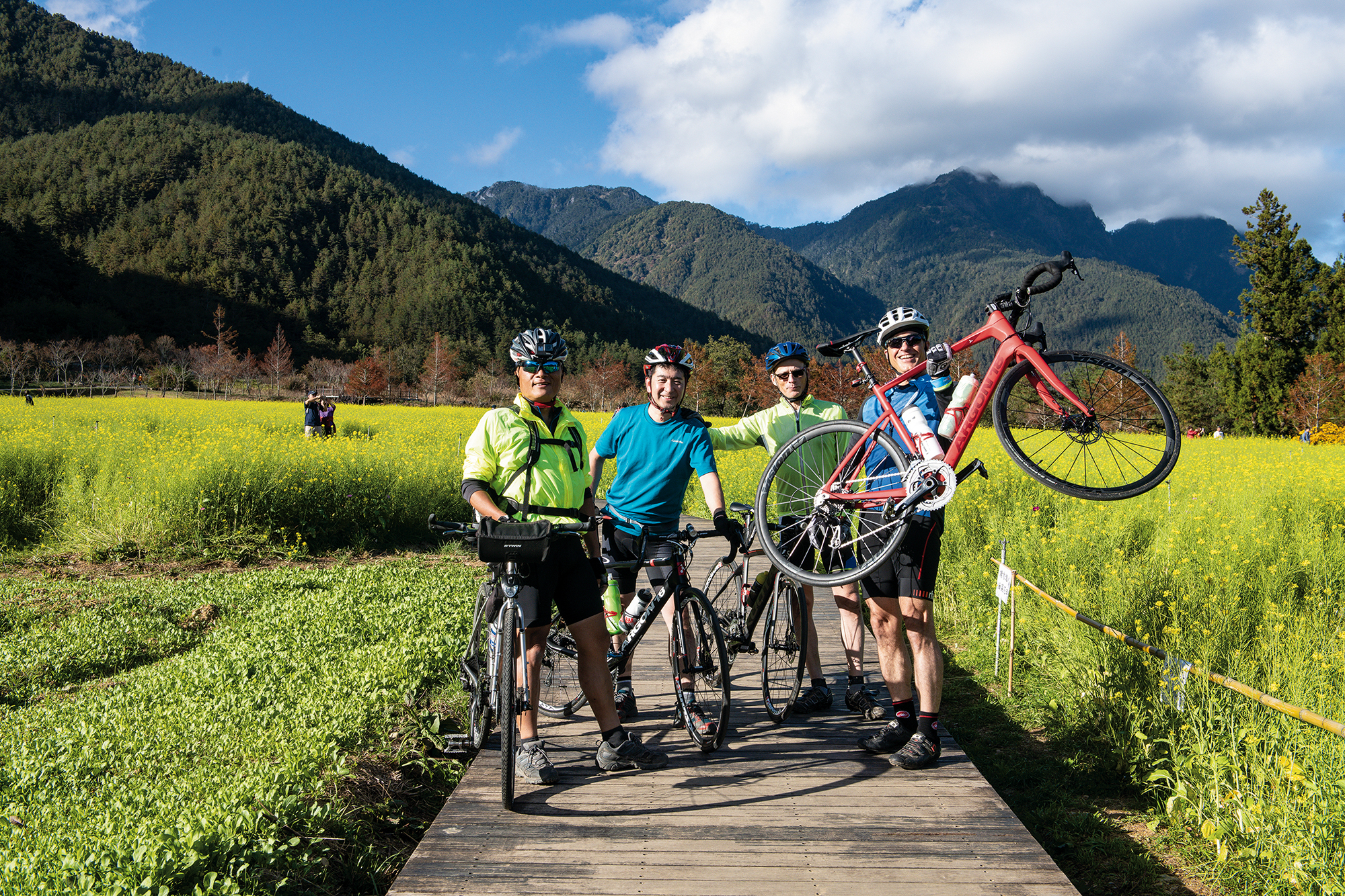 右からイスラエル人のガノーさんとイーサンさん、日本人の春田篤志さん。彼らは自転車の旅をするために台湾を訪れ、『台湾,用騎的最美(台湾、自転車で行くのが最も美しい)』の作者・陳忠利さん(左)がリーダーを務めていた。