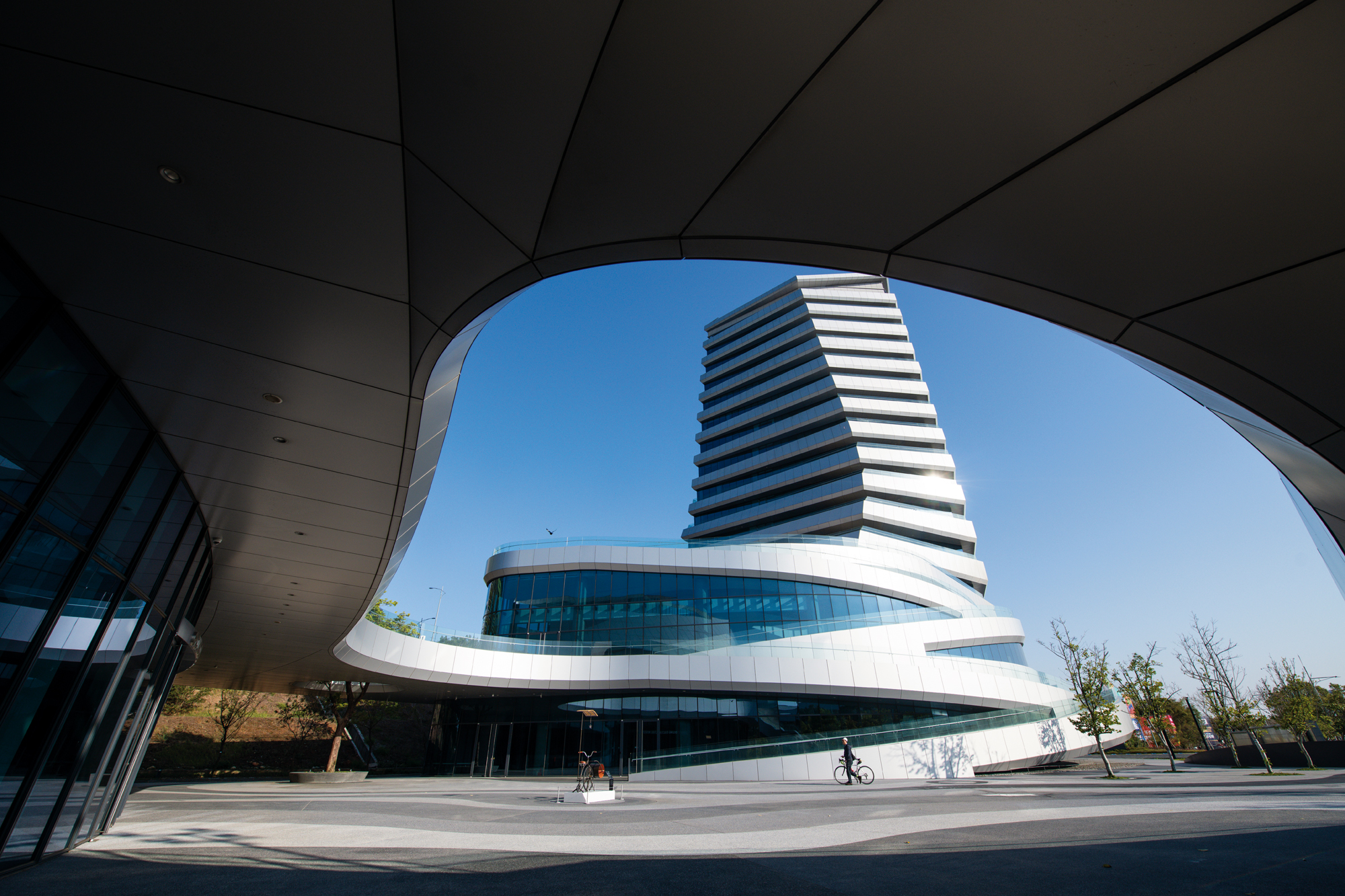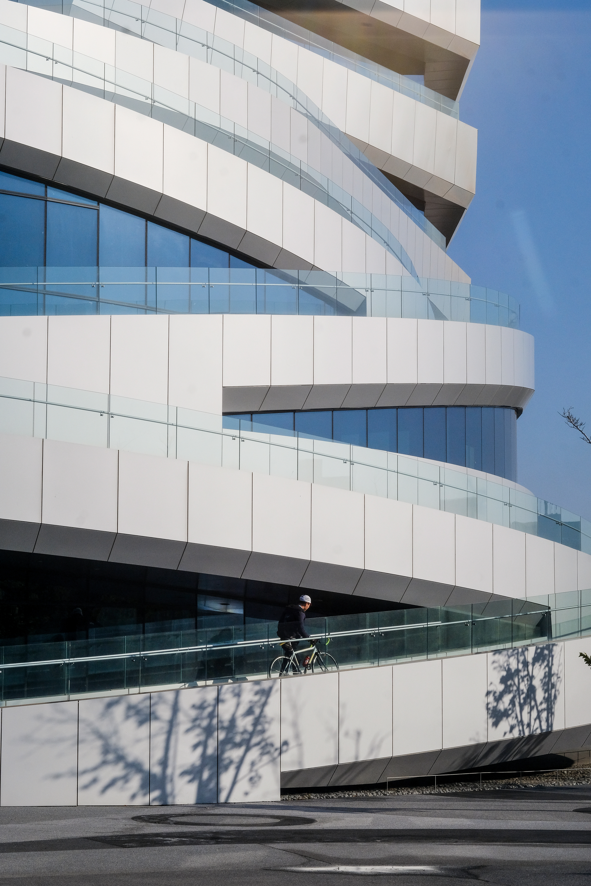 早朝のサイクリングを終え、次に向かったのは自転車メーカー、ジャイアントの新本部ビルの横にある「自行車(自転車)文化探索館」だ。台中に来る前に我々は建築家の潘翼にインタビューしていた。彼によれば「探索館は最大の展示空間を生かすためにシェル構造を用い、屋根はジャイアントのロゴの形にしました」という。潘翼の作品は公共建築から企業ビルまで台湾各地に点在する。「デンマークのルイジアナ近代美術館の外にある、英国彫刻家ヘンリー・ムーアの作品がインスピレーションです。高低差のあるものを組み合わせた作品で、そこからジャイアント・ビルの高低の対比が生まれました。流動的なデザインは自転車文化からきており、流動的で自在な心を表しています」「外壁の色は厳選したブライトシルバーで、時間によって変化する陽光を反射し、自転車の躍動感を感じさせます」と語る。