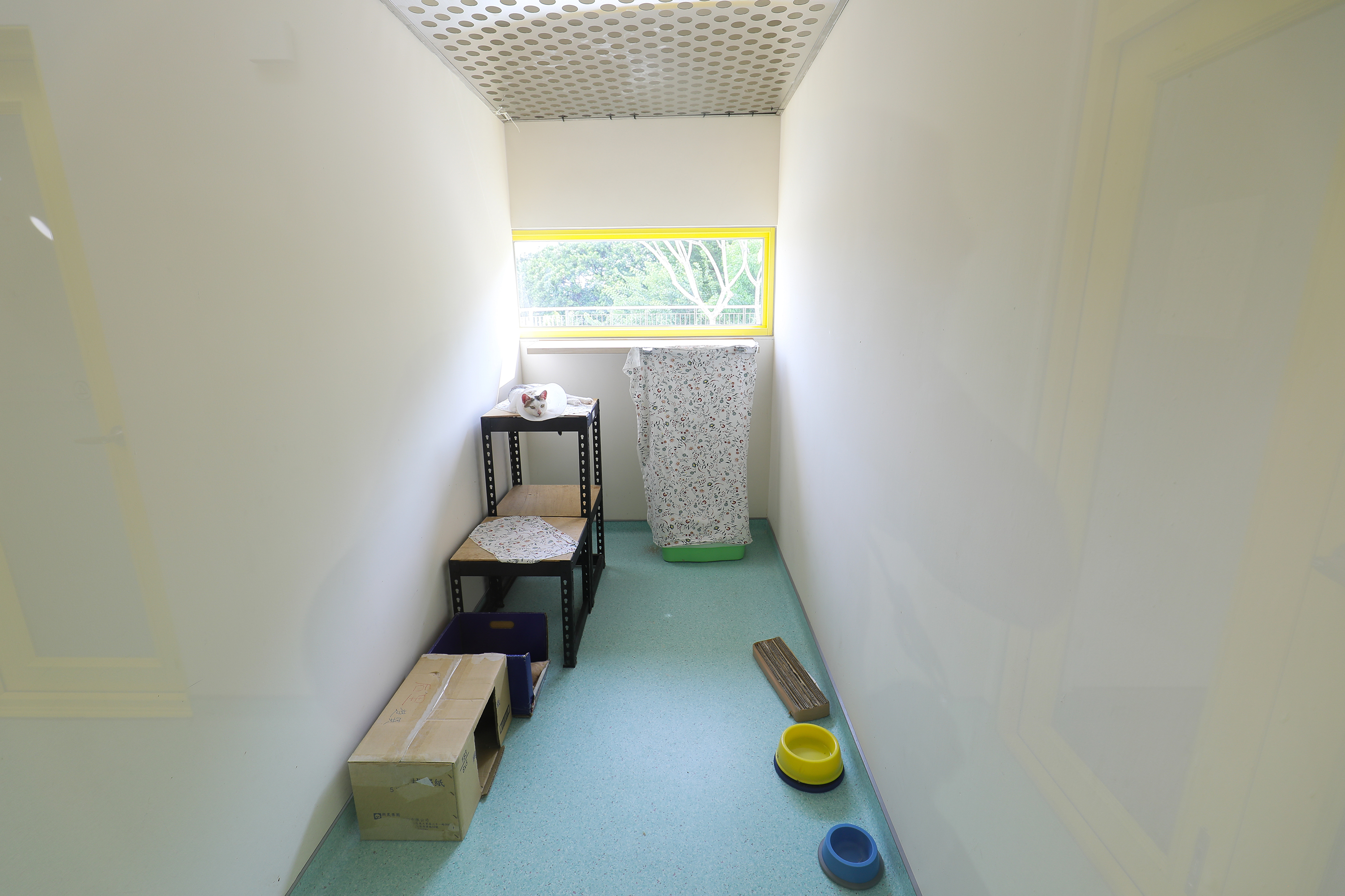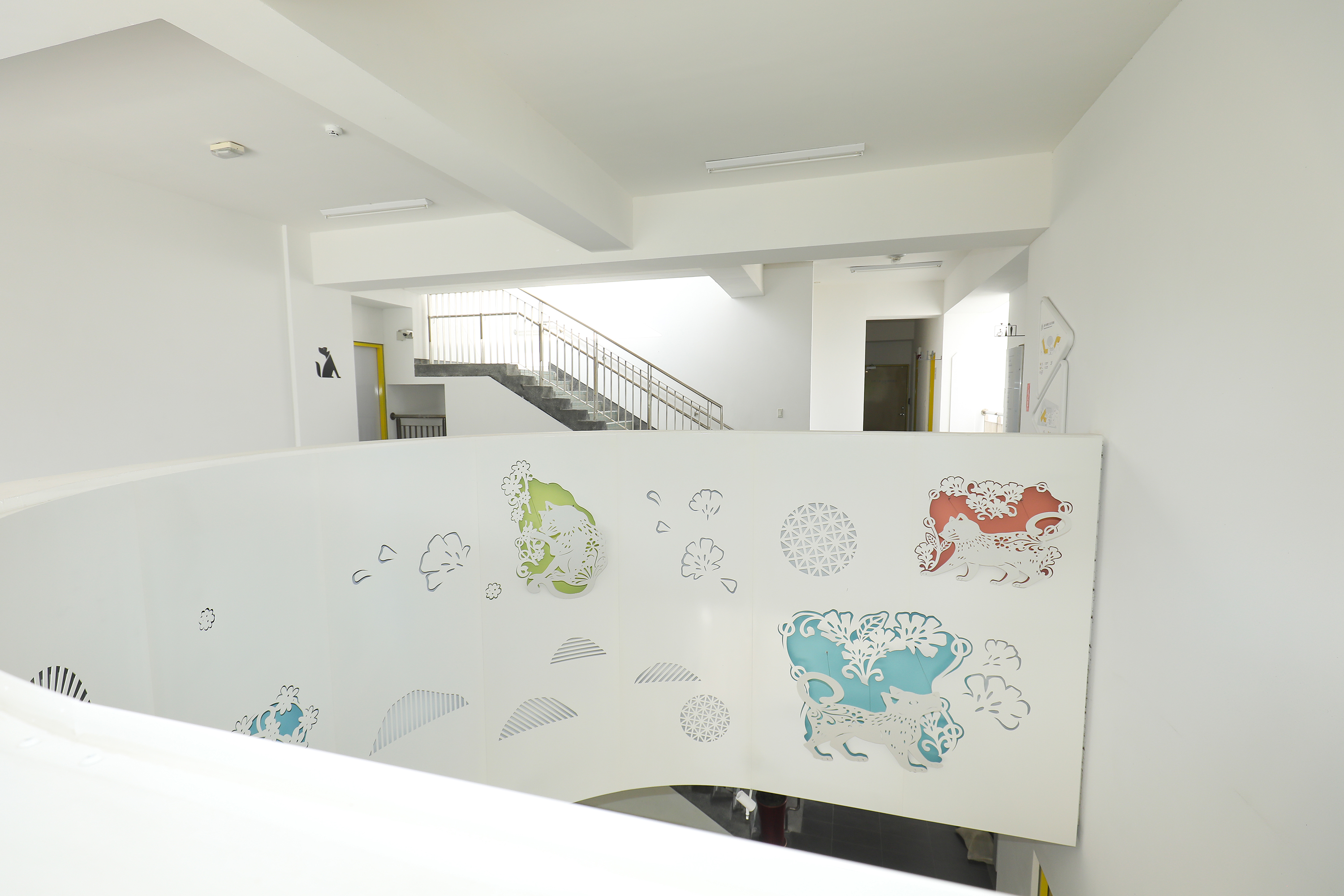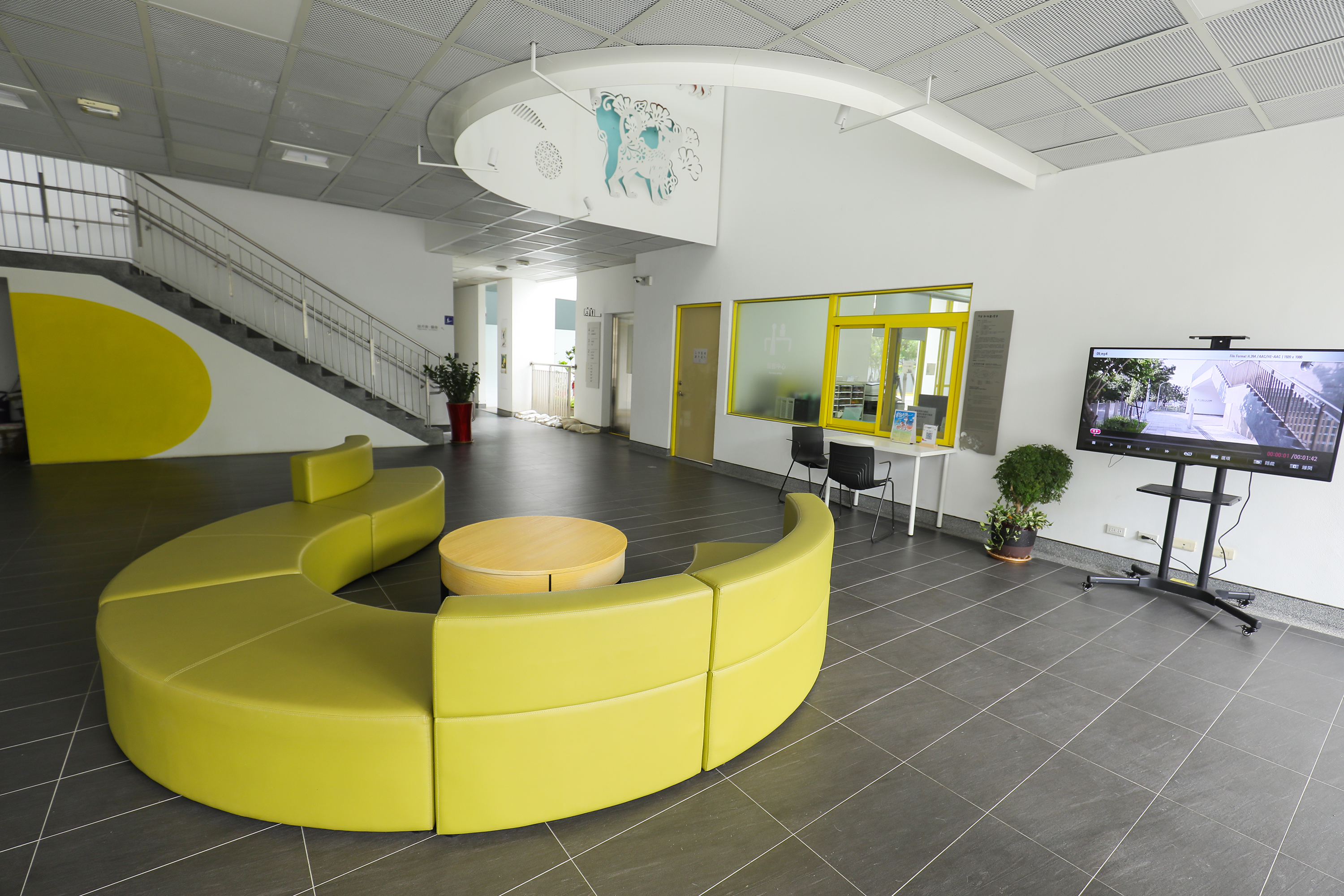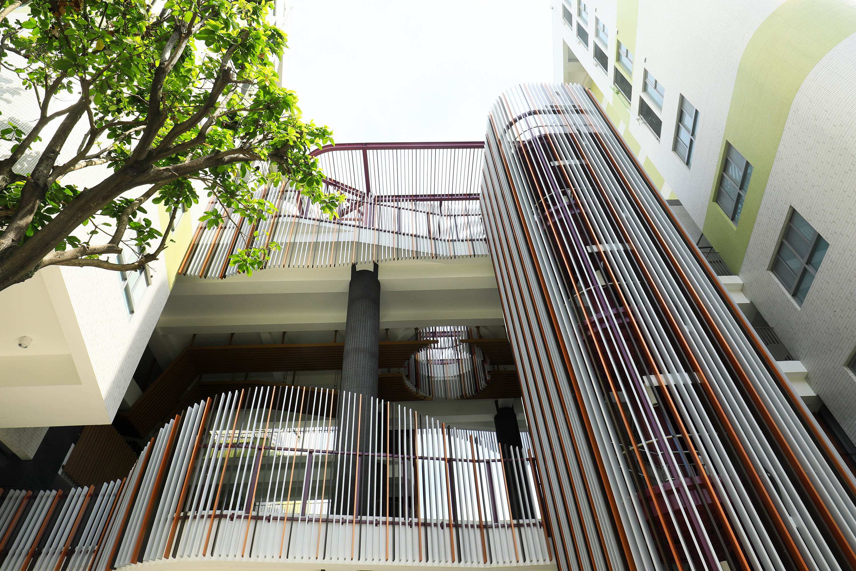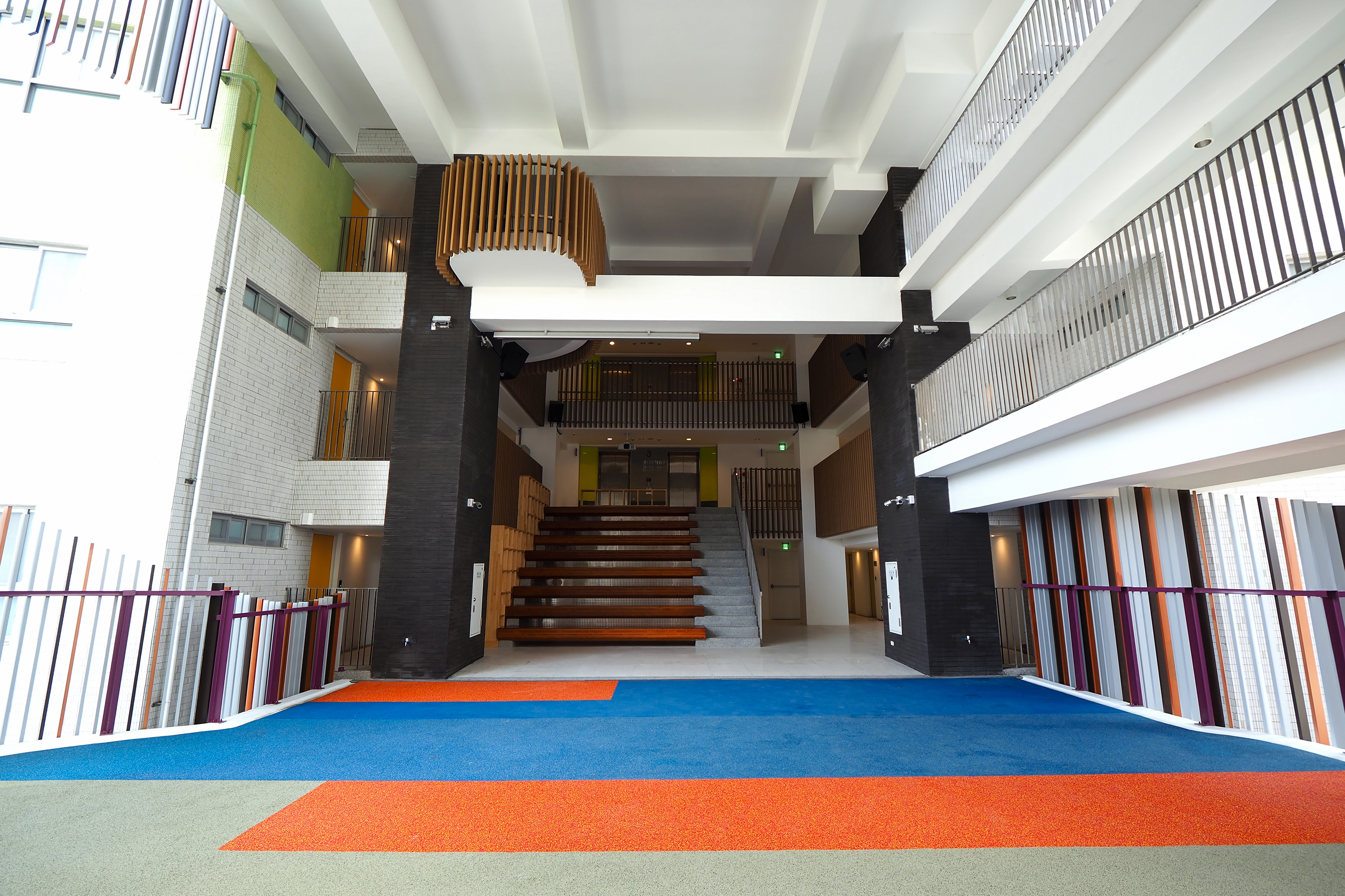 2棟がつながるスペースは2階と5階にある。高さ10メートル近い吹き抜けの半屋外の空間だ。床はラバーシートで高齢者や子供の安全に配慮してあり、黄色、オレンジ色、青、緑と大胆な色彩を配し、住民同士が活発に交流できる生き生きとした空間を目指した。周囲は壁ではなく手すりにすることで、眷村の竹垣のようなイメージを作り出した。姜楽静は芸術家の友人のアドバイスを受け、木の色、オレンジ色、銀色の3色を用い、1対1対3の割合でリズム感を出している。