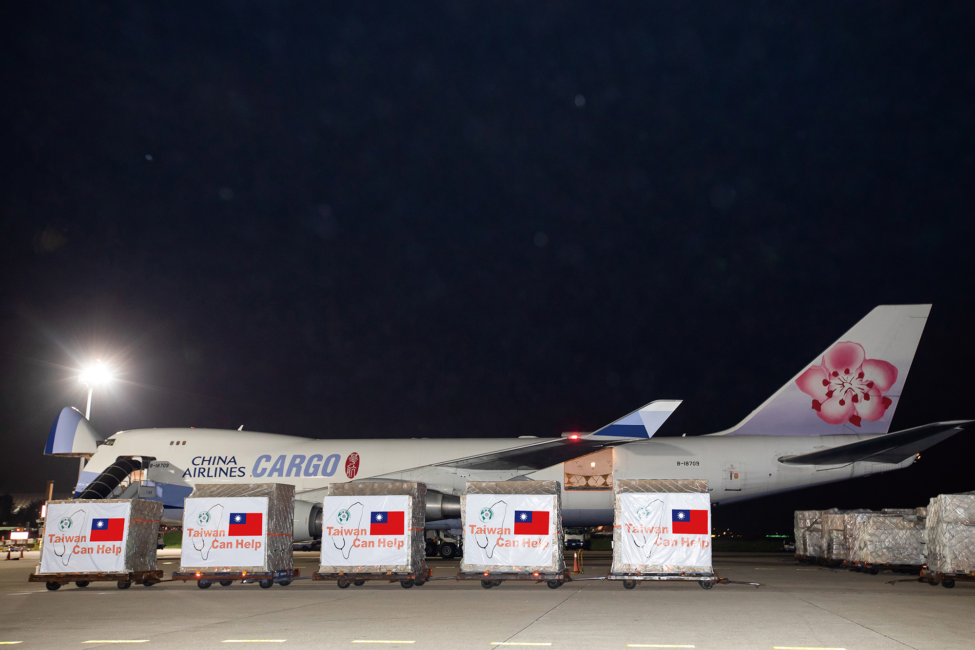 世界での新型コロナウイルス感染拡大に際し、台湾は医療物資を海外に送り届け、「Taiwan can help」の精神を示した。(陳美玲撮影)