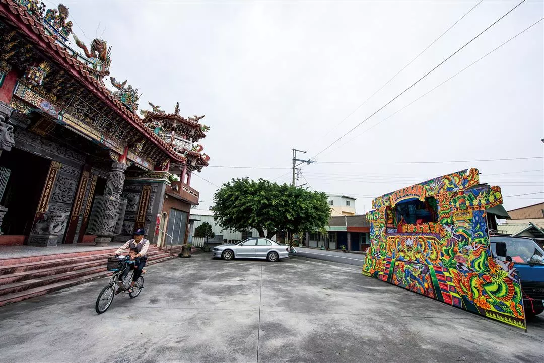 私たちが取材に訪れた日、陳志能は雲林県斗南鎮の玄興宮(包公廟)において、過去一年間の家内安全を神明に感謝する江家一族に招かれて、神への感謝の奉納公演を行なうことになっていた。夫婦は二人で大道具、小道具一式を小型トラックに積み込んで出かける。会場に着くと、荷台の屋根を開き、二人で木の支柱を組み立てると、トラックはわずか10分ほどで、トランスフォーマーよろしく煌びやかに光り輝く人形芝居の舞台に変身する。