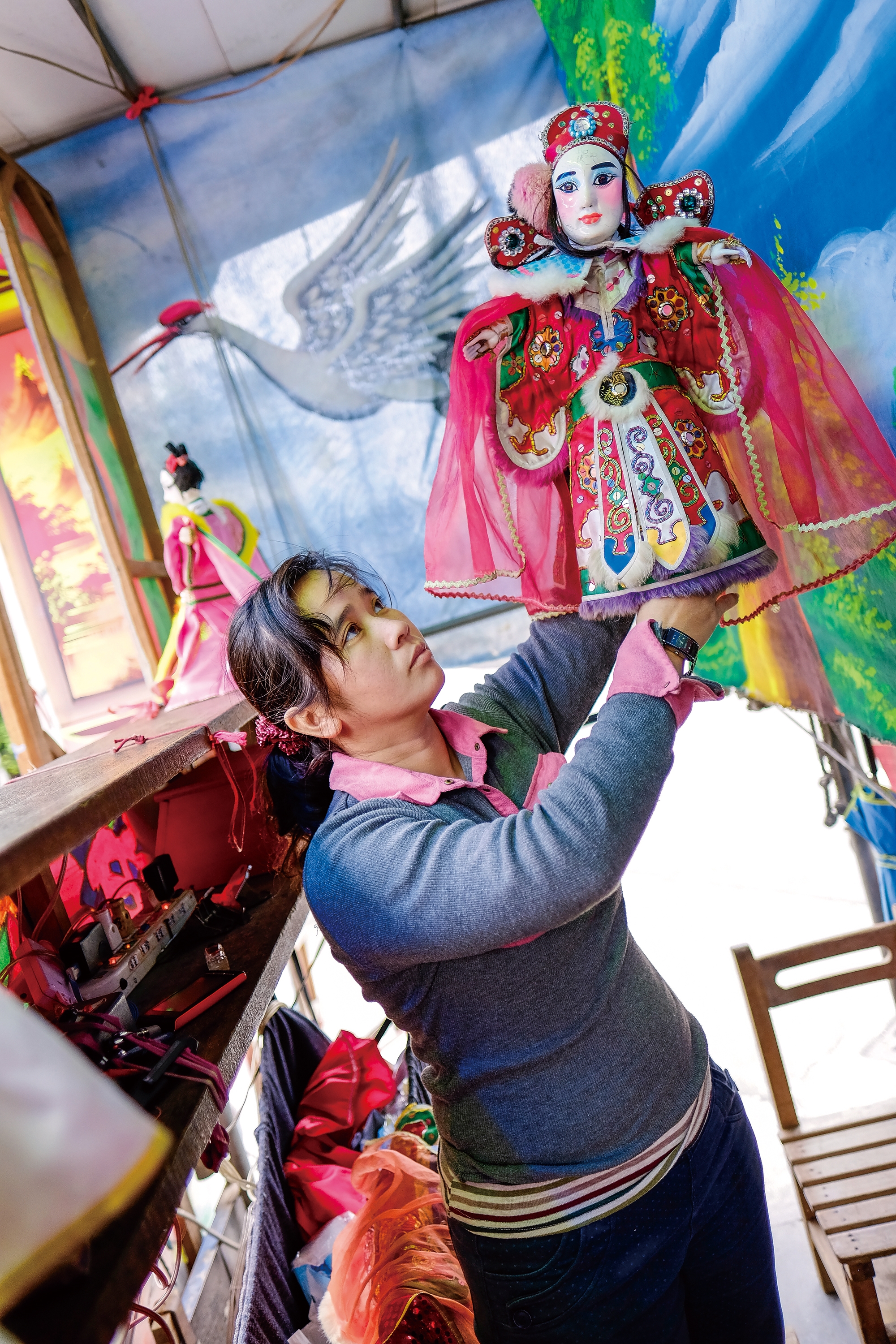 葉蘇珊は決まりに従って、まず「扮仙戯」を上演する。人形が神仙を演じ、人々の願いや訴えを天に伝えるため、演目は神仙芝居から始まるのが仕来りとなっている。葉蘇珊はまず福仙、禄仙、寿仙の三尊の人形を舞台の定位置に上げる。神明なので、人形はゆっくり厳かに移動させなければならないと、人形を動かしながら彼女は説明してくれる。次いで、ほかにも出演させる人形を裏手に準備し、びっしりとインドネシア語で書き込みをした脚本を開いて、人形一つ一つの登場の順序を確認した。人形にはそれぞれ専用の出の音楽があるので、彼女は音楽を聴けば出番の人形が分かる。彼女は男女の人形の歩き方も説明してくれた。女の人形は艶やかになよなよと、男の人形は豪快に早足で歩かせるのである。