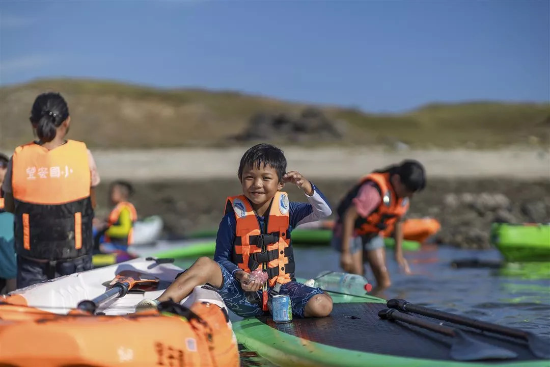 岳明の教員と児童らは、澎湖の望安小学校の仲間たちと一緒にカヤックを漕ぎ、漂着ごみを拾って海の環境を守った。