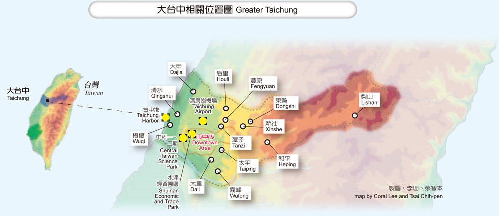 大台中エリアの地図を開くと、2200平方キロの市はレンゲのような形をしている。かつて台中県に属した地域は山・海・屯の三大エリアに分けられ、それぞれ異なる自然資源や文化産業を擁する。レンゲの柄の部分に当る東部には、中央山脈の山間に位置する和平、東勢、新社の3区がある。そのうち最大の面積を誇る和平区は梨山の温帯果物と中部横断道路の高原野菜が有名で、東勢と新社は昔から客家の集落で知られており、中でも新社は最近レジャー観光産業で注目されている。山と海に挟まれた屯エリアには市街地が広がり、北の豊原は旧県庁所在地のある行政の中心であり、潭子は工業地帯、后里は生花産業が盛んだ。南の大里と太平には工場が密集し、霧峰にある台湾省議会と林家花園は重要な文化遺産である。海に面した西側には大甲、清水、梧棲、龍井などの区があり、漁業が盛んで、沿海には湿地もある(11ページの地図を参照)。