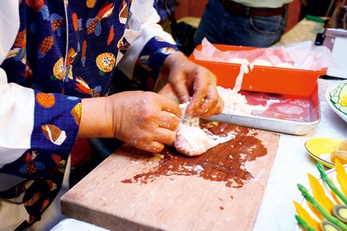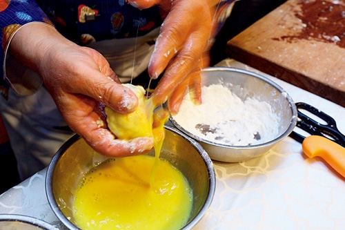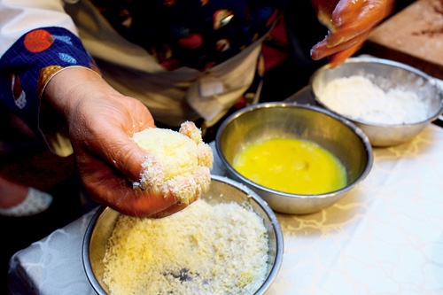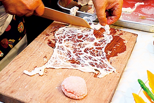 「氷のフライ」の作り方。――氷を餅でくるみ、それを網脂でしっかり包み、卵液、小麦粉、パン粉をまぶして揚げる。