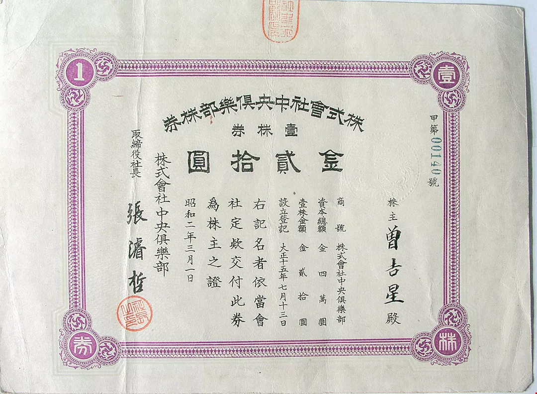 資金を集めて創設された中央倶楽部。写真は1927年に発行された株券である。