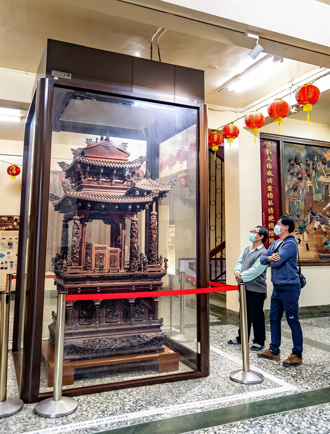 この「城隍使司神輿(八獅座武轎)」は、地方の有力者が資金を調達し、名工の黃順財率いる20人余りの職人によって建造された。1926年に完成し、1996年に役目を終えたが、2018年に文化部が「重要古物」に登録し、現在は廟の宝として城隍廟後殿の2階回廊に展示されている。廟の担当者が、温度・防湿管理がされたボックスの扉を開けて木製の神輿を見せてくれた。生き生きとした精緻な彫刻の素晴らしさは息を呑むほどだ。