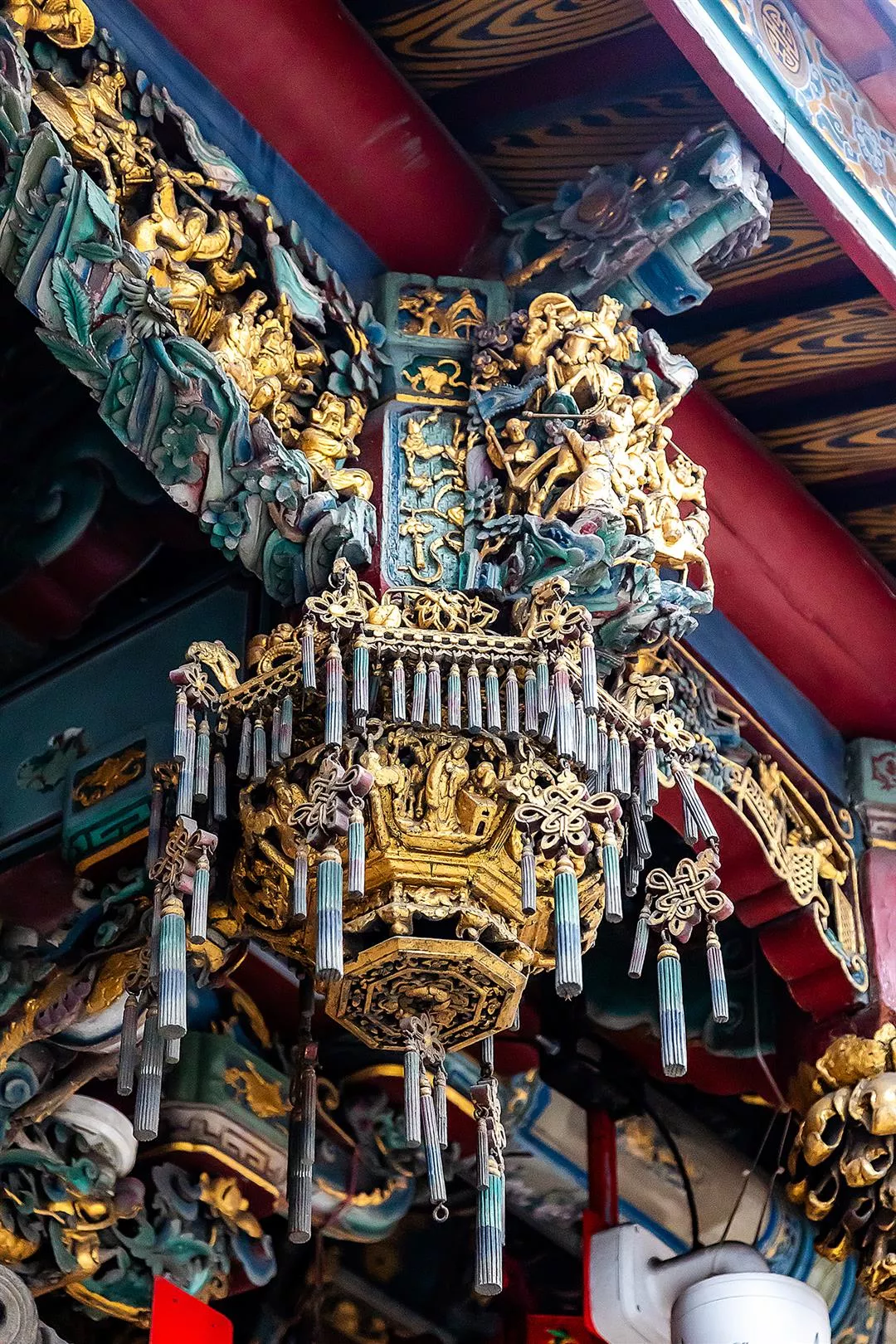 名工の陳應彬は、文字の形に躍る「角のない竜」の装飾が施された壁を神轎にあしらった。陳應彬お得意の技法で、「北港朝天宮」の文字が見て取れる。