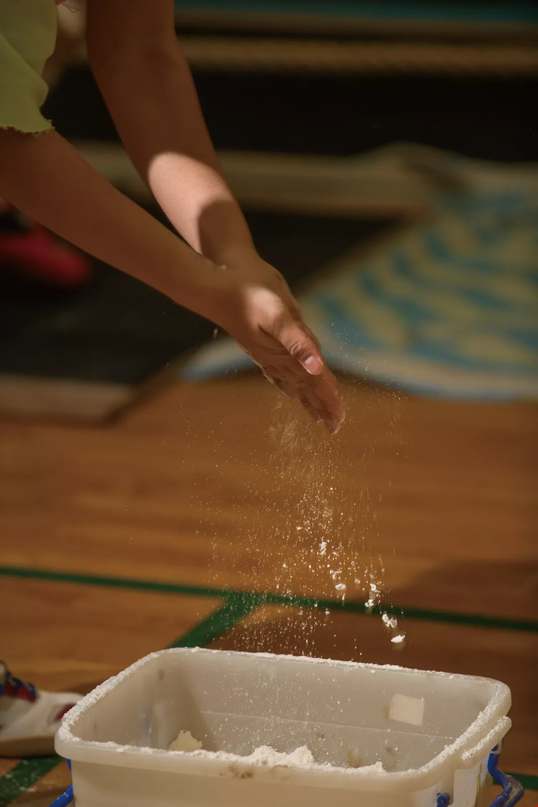 選手たちは、手にグリップパウダーをつけて試合に臨む。