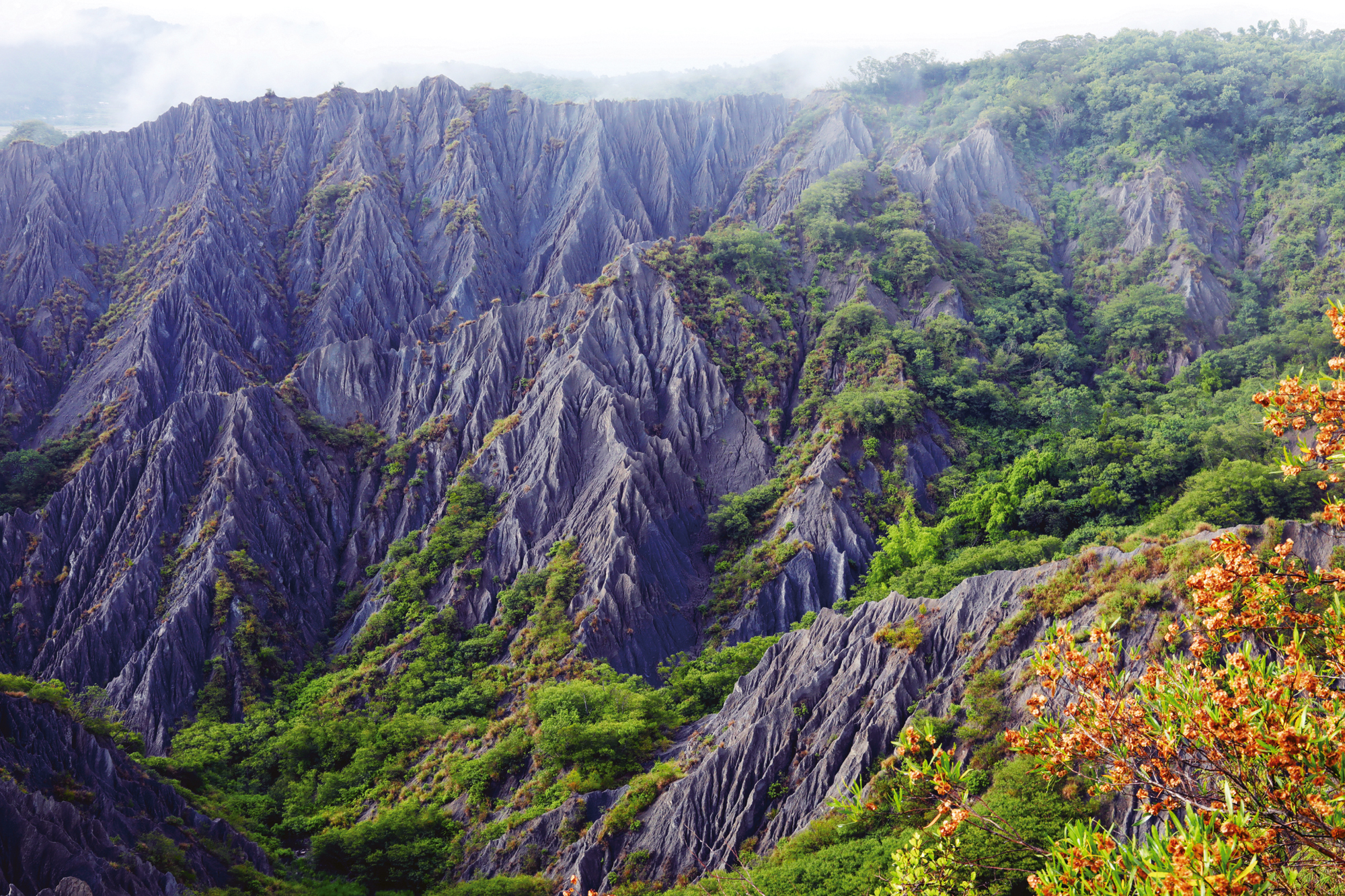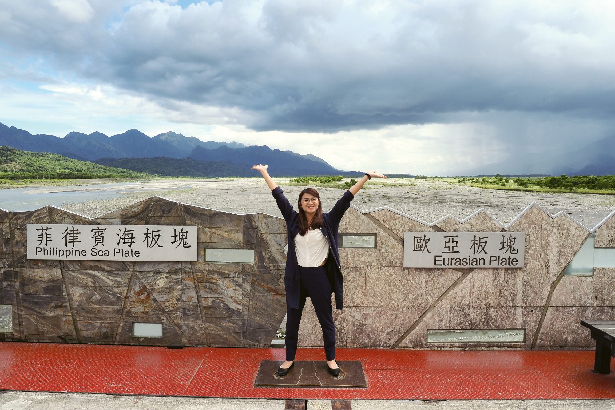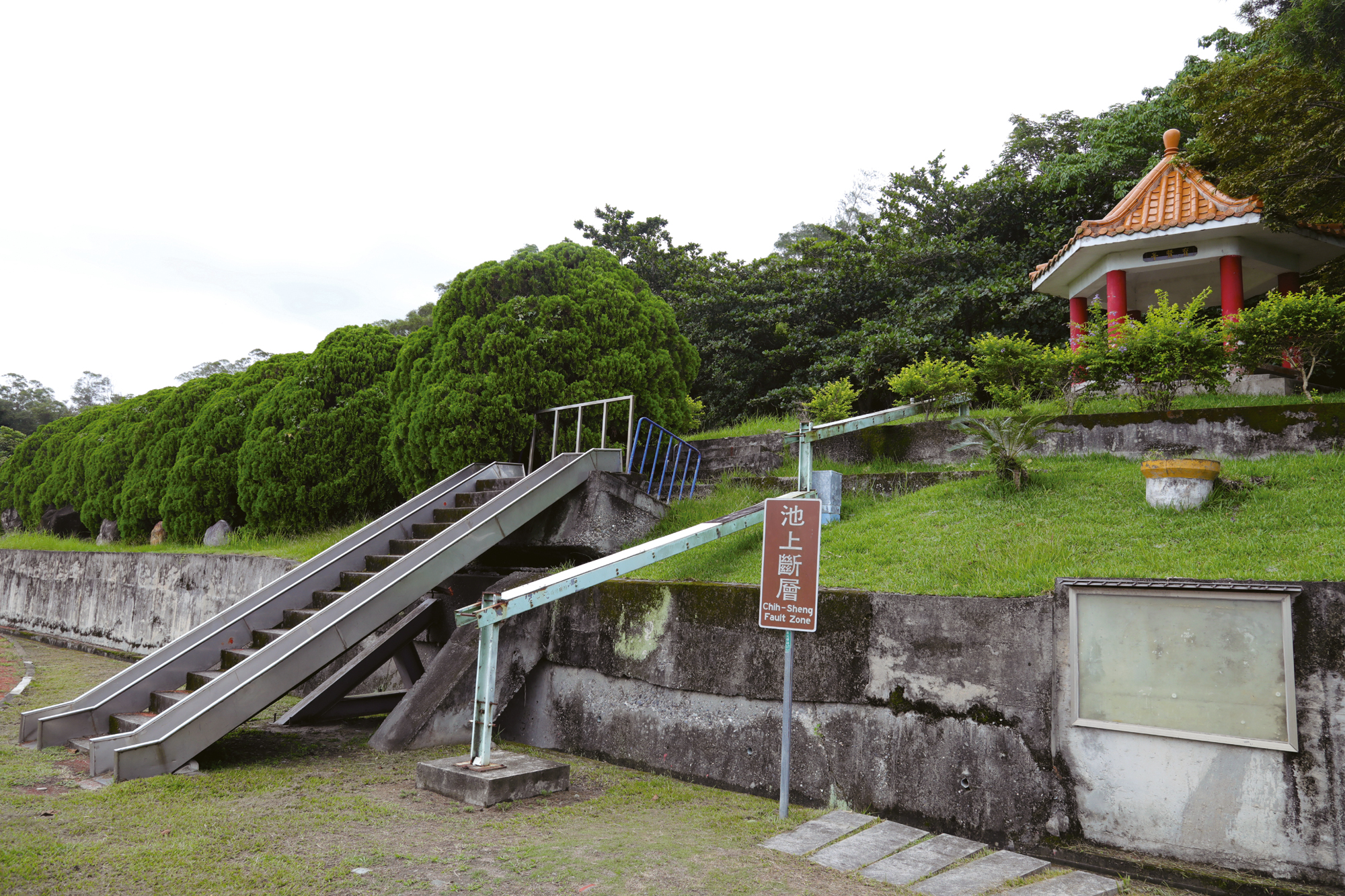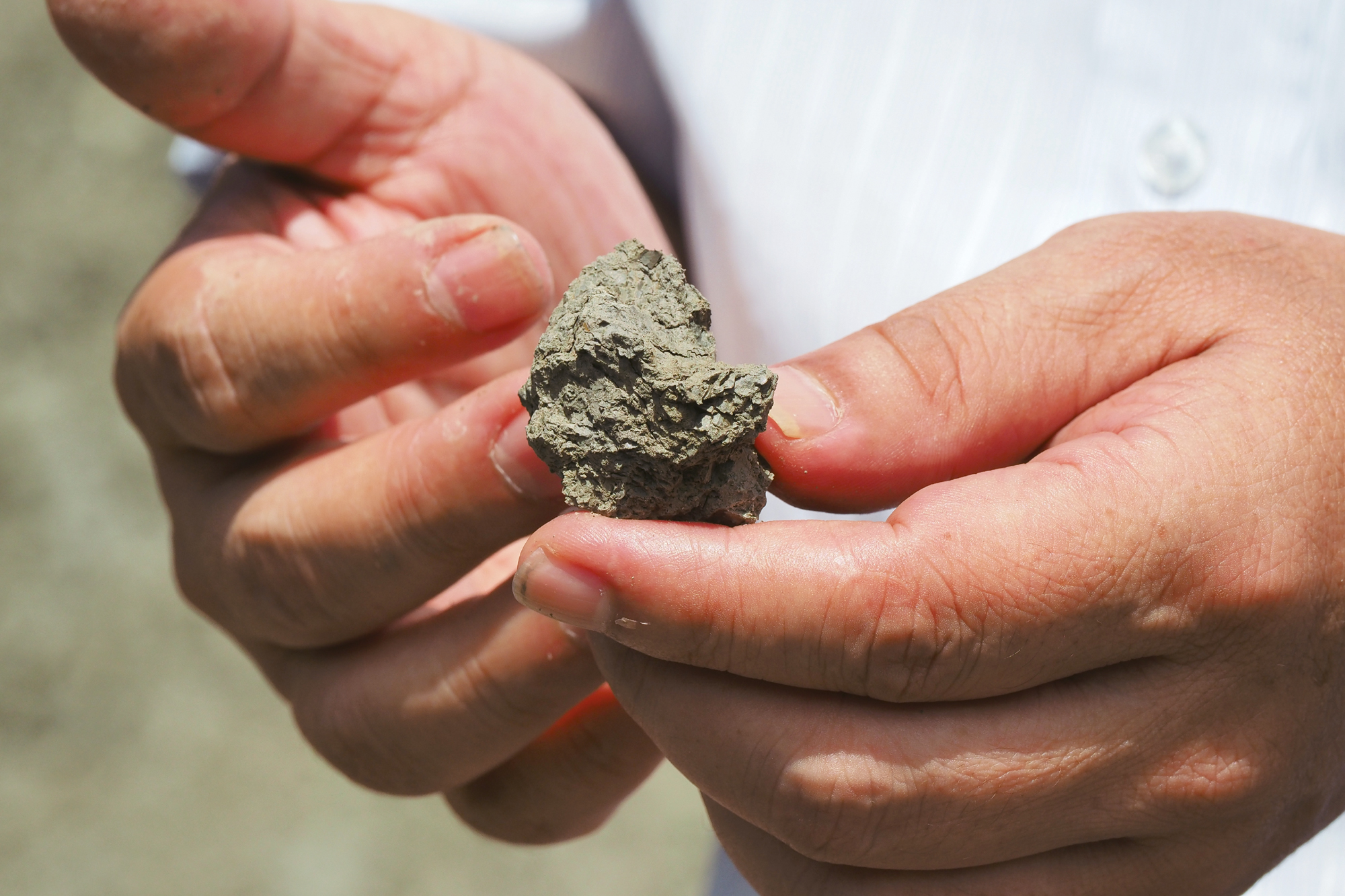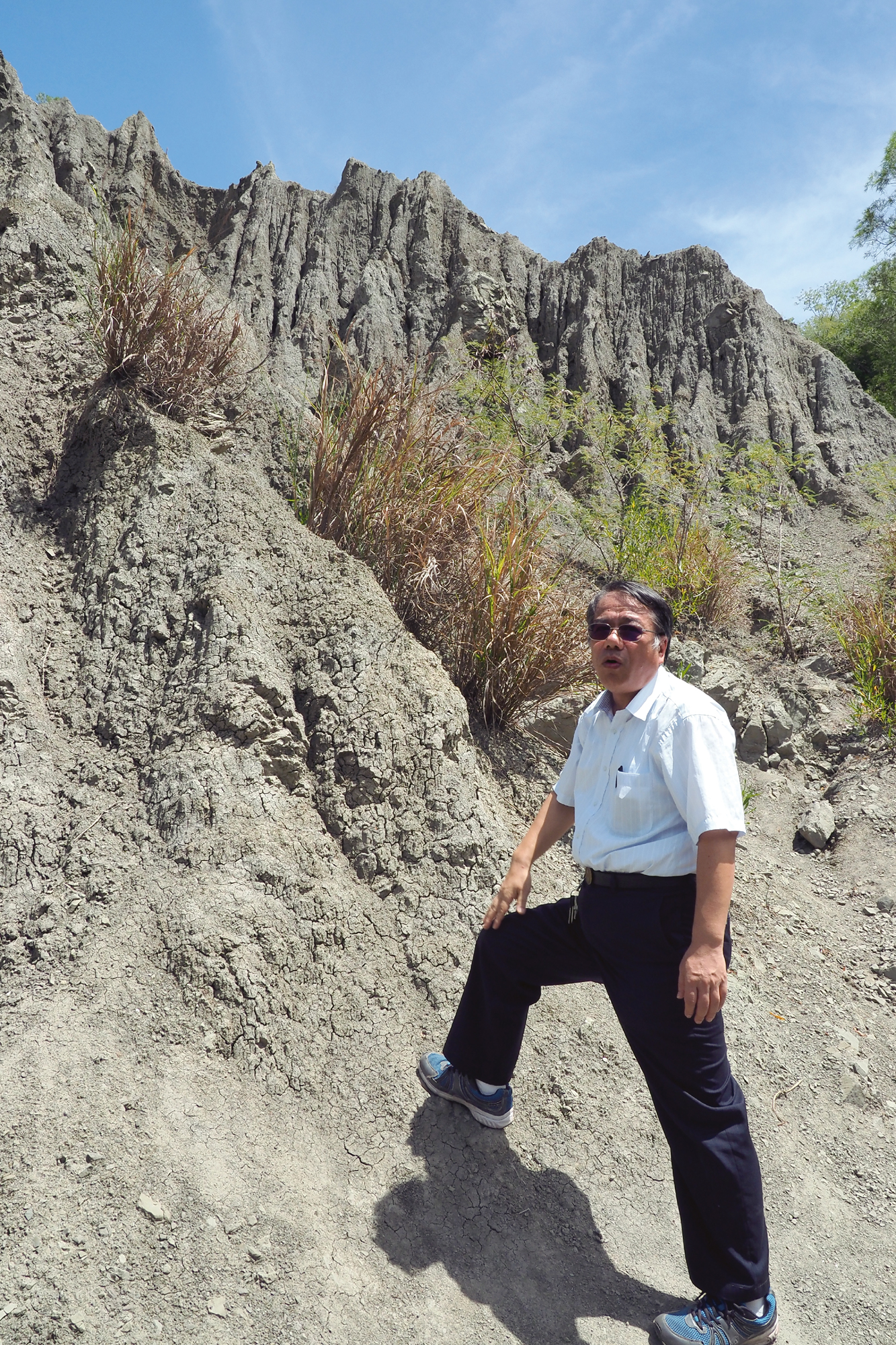 東華大学の劉瑩三教授は、利吉泥岩悪地の地層の中からリンを含む光る欠片を取り、プレート運動によって形成された大地であることの証明だと説明する。