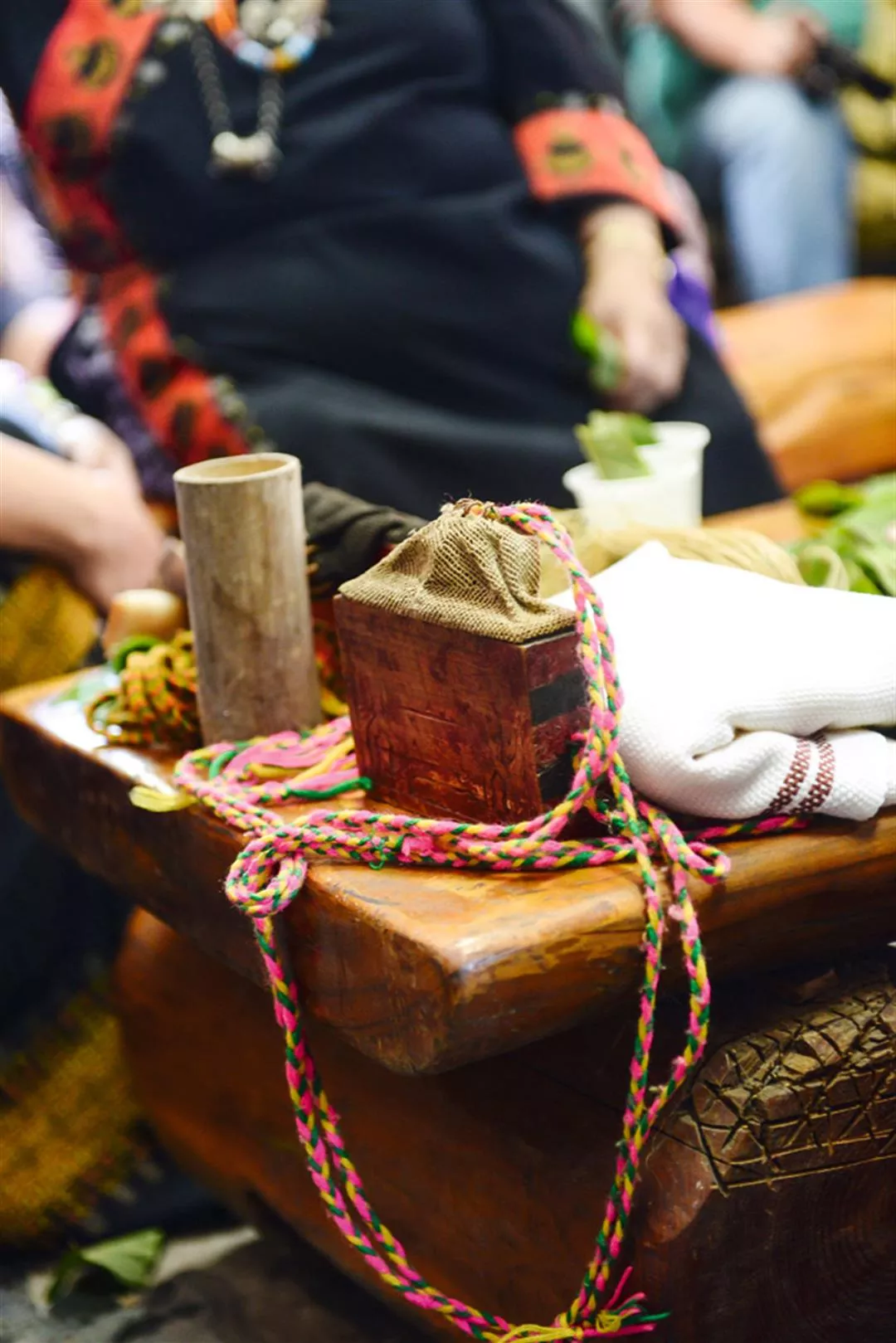 パイワンの女性シャーマンは師から巫術箱を引き継ぐ。箱の中には豚の骨と小刀、神珠といった法器が入っている。
