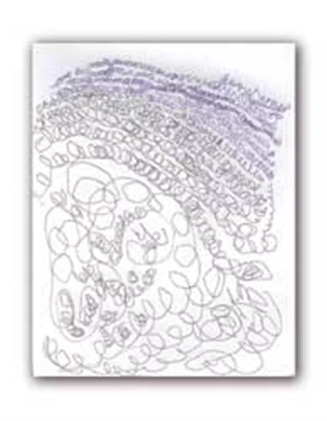 描き出してみると蘇さんのペンは止まることを知らず、力を込めて猛スピードで紙に線が広がっていき、一息に3枚も描いた。郭育誠氏は、今度は清涼感のある青いボールペンを渡して、涼やかな海風に揺れる青草のイメージで紙に円を描かせてみた。蘇さんは夢中になって紙にびっしりと円を描いていたが、その忙しないタッチは次第にゆったりしたものに変っていった。こうして20分ほどペンを走らせている間に、蘇さんは耐えられない痒みを忘れていたのである。主治医に蘇さんの絵を見せると、直ちにどれほどの痒みであったのかを理解したと言う。