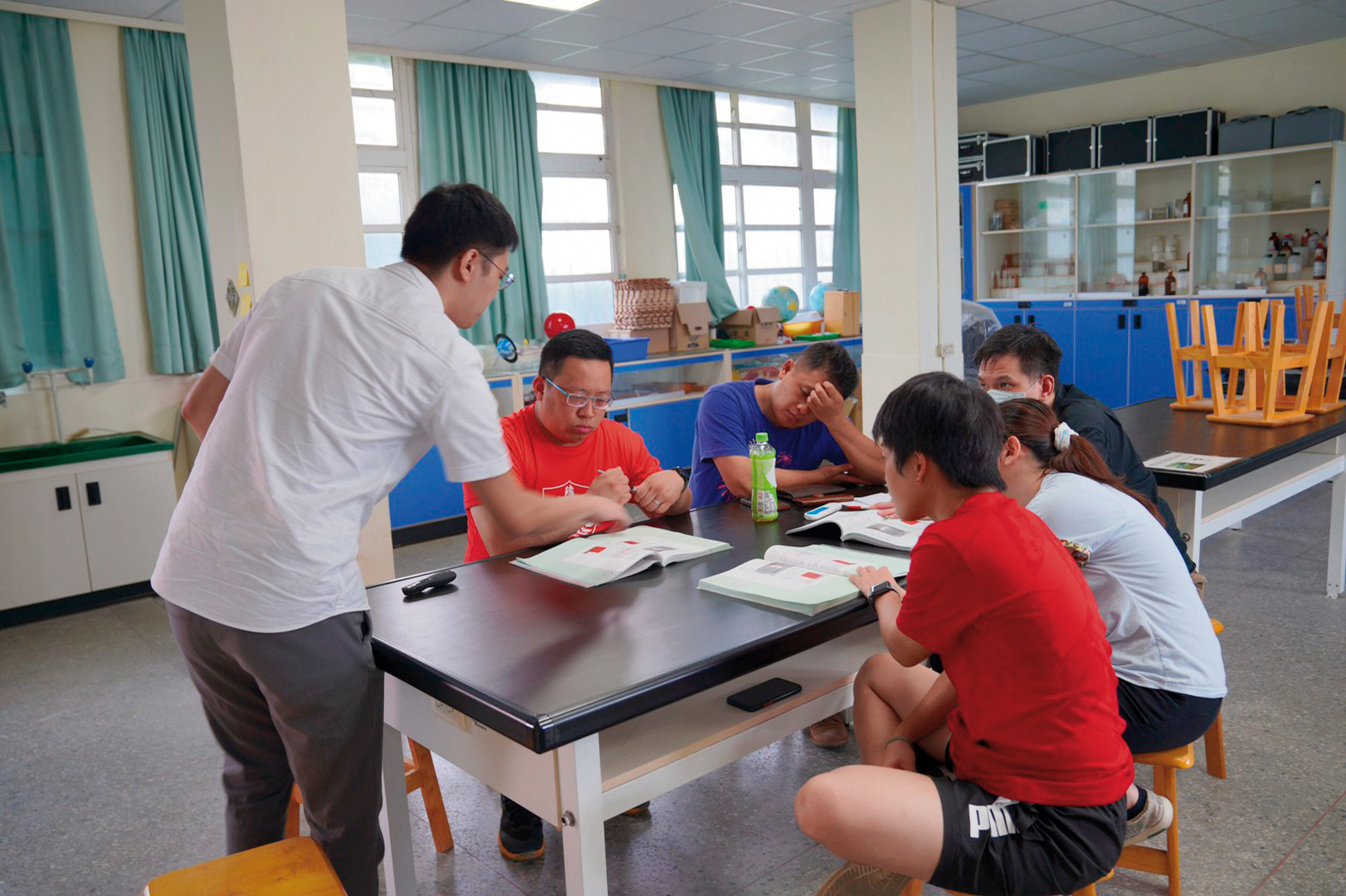 台湾コベストロはテレビや雑誌の科学教育顧問を招いている。写真は、科学ゲームの本を多数出している許兆芳(毛虫先生)が台北啓聡学校の生徒に実験のやり方を教える様子。