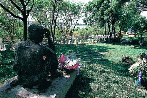 地面に座り、片腕を膝に乗せて物思いにふける。烏山頭ダムを見下ろすこの銅像は生前に立てられたもので、在りし日の八田の姿をしのばせる。