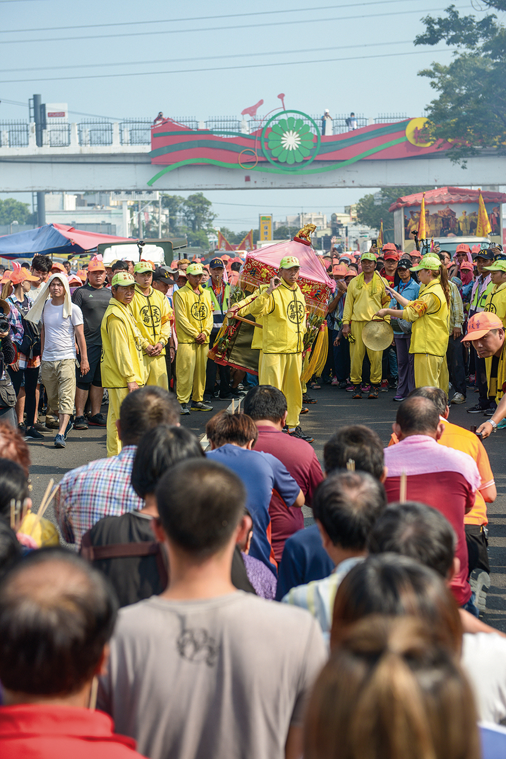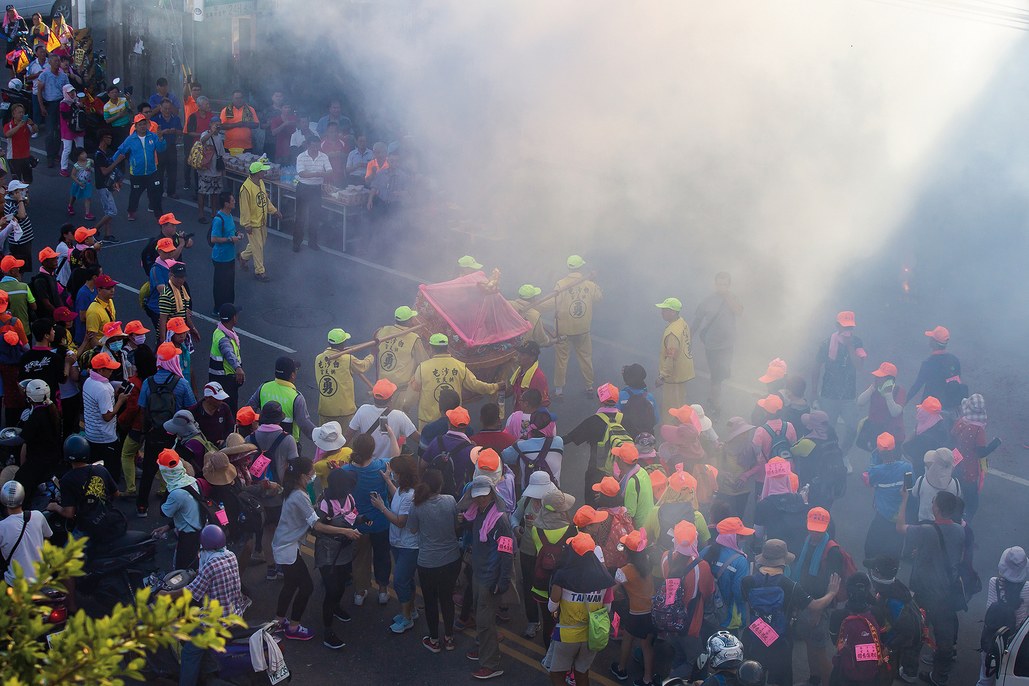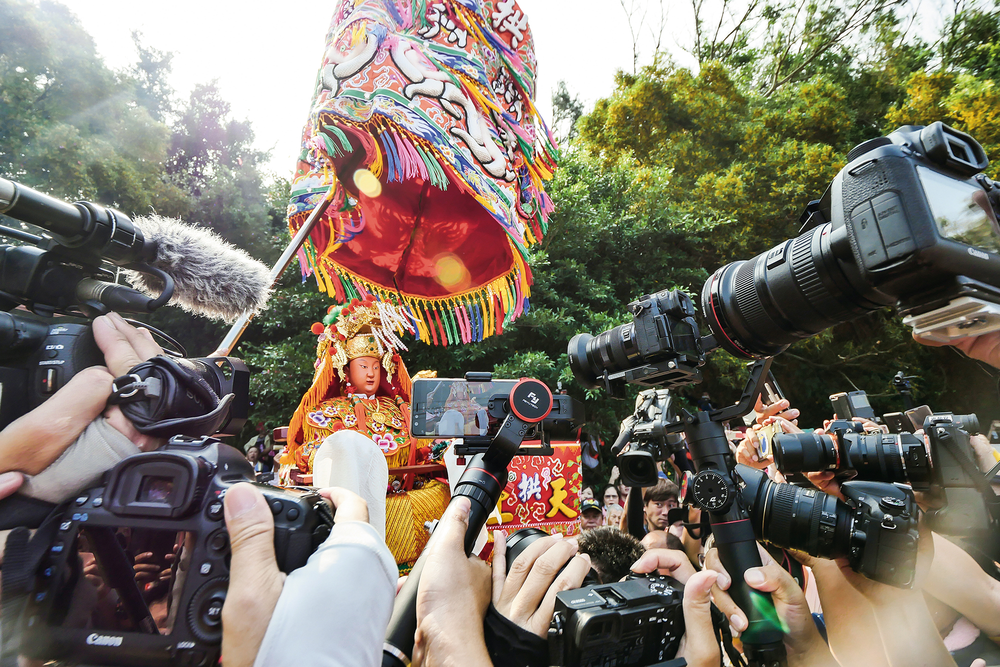 媽祖の神輿が宮に帰る日、神像は4人が担ぐ神輿から8人が担ぐ神輿に乗り換える。カメラマンたちは、媽祖像の御顔が見える瞬間を狙ってカメラを向ける。(林格立撮影)