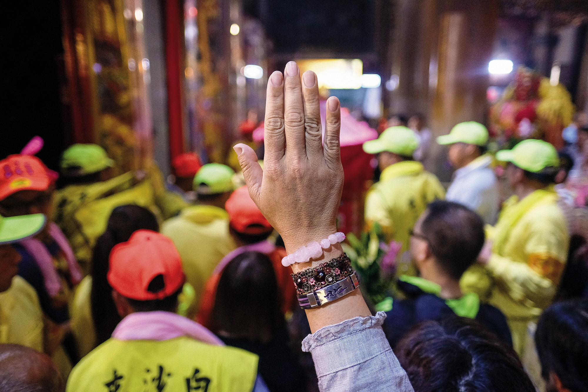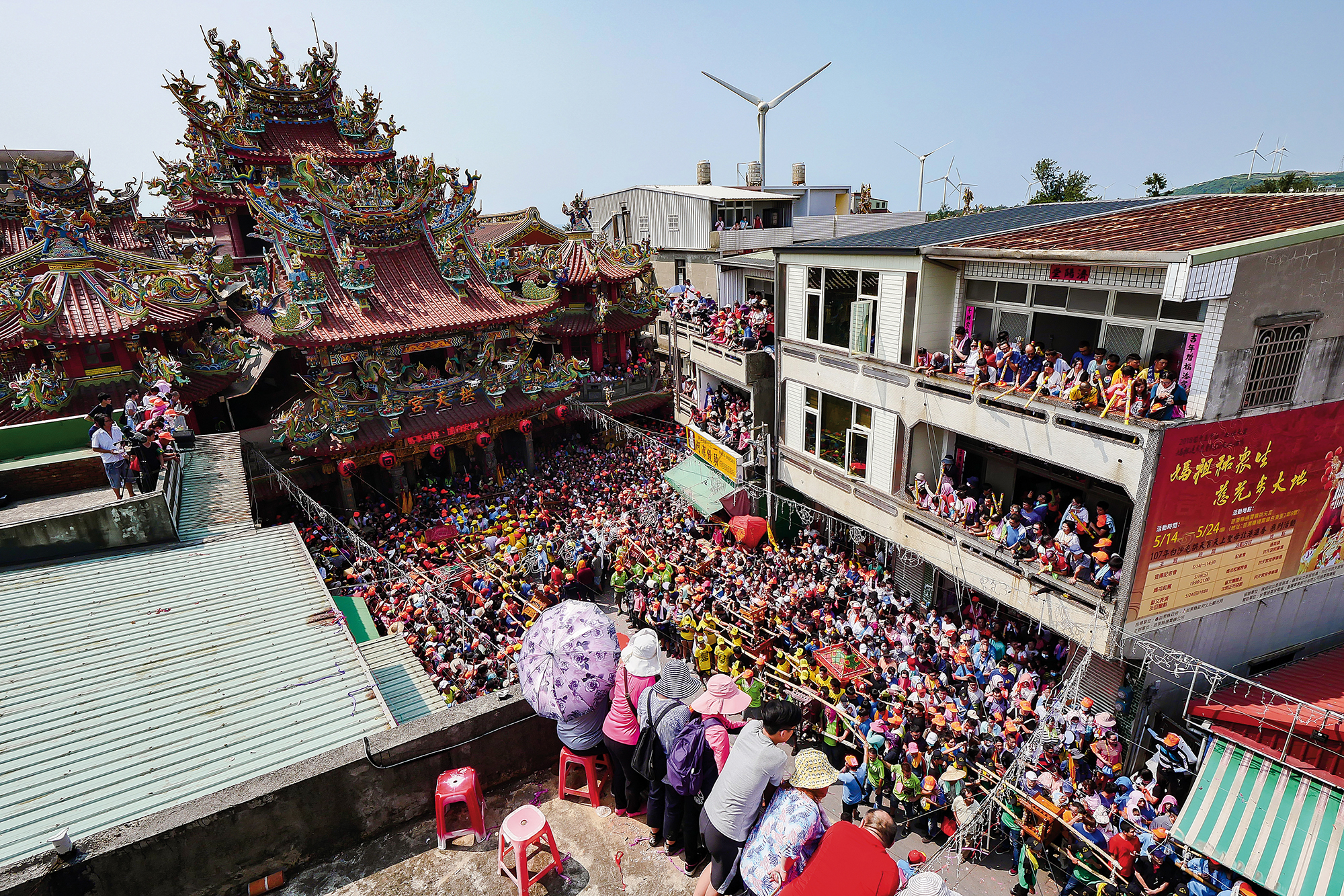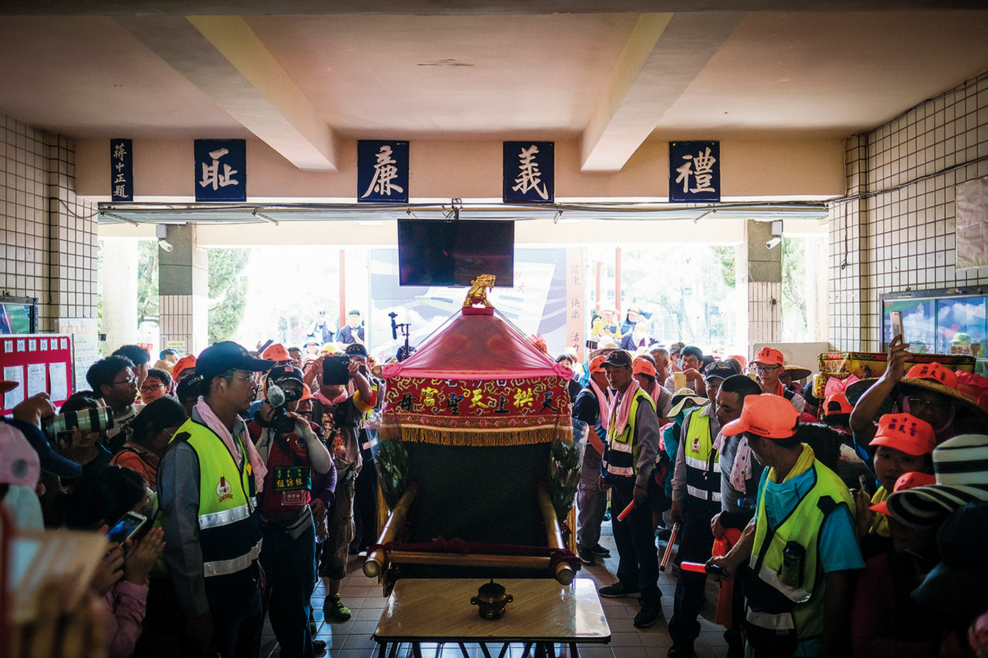 媽祖の神輿が宮に帰る日、神像は4人が担ぐ神輿から8人が担ぐ神輿に乗り換える。カメラマンたちは、媽祖像の御顔が見える瞬間を狙ってカメラを向ける。(林格立撮影)