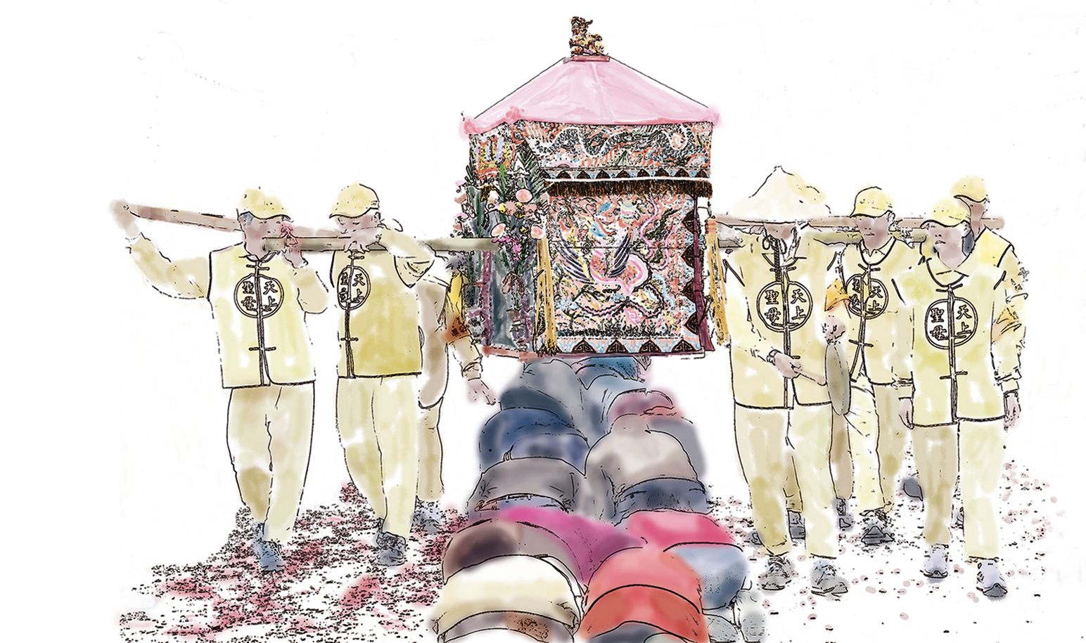 「白沙屯媽祖の巡行」は信者たちが代々受け継いできた宗教儀式で、すでに150年以上の歴史がある。徒歩で進むルートは苗栗県から台中市、彰化県、雲林県にまたがり、最後は北港朝天宮に参拝する。全行程320キロの道のりである。毎年、巡行の時期が近づくと、拱天宮の委員とその年の炉主が媽祖様に擲筊でお伺いを立て、出発日と朝天宮への到着日、そして帰還日を決める。また沿線で神輿を止める場所やルートも、媽祖様が神輿を担ぐ人々を率いて決めていくというのが、この巡行の最大の特色だ。
