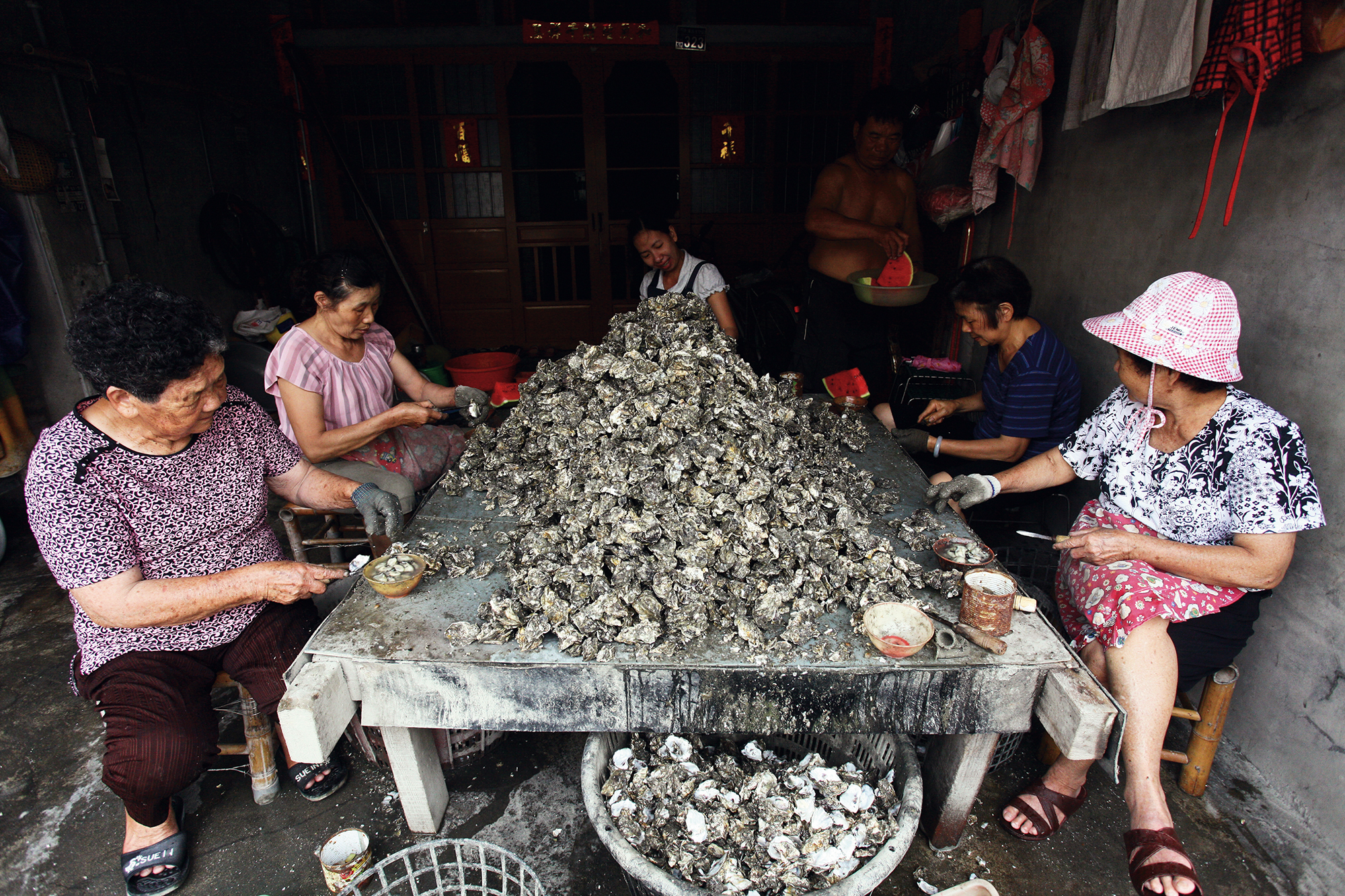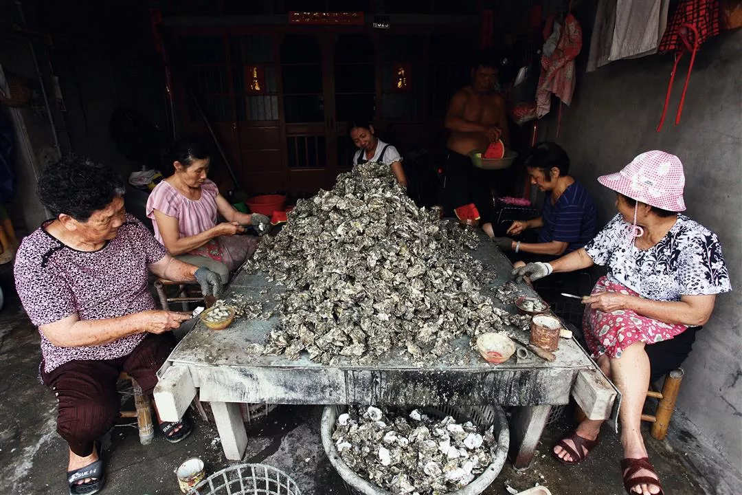 見事な手さばきで殻を剥いていく中高年の女性たち。(彰化県王功)