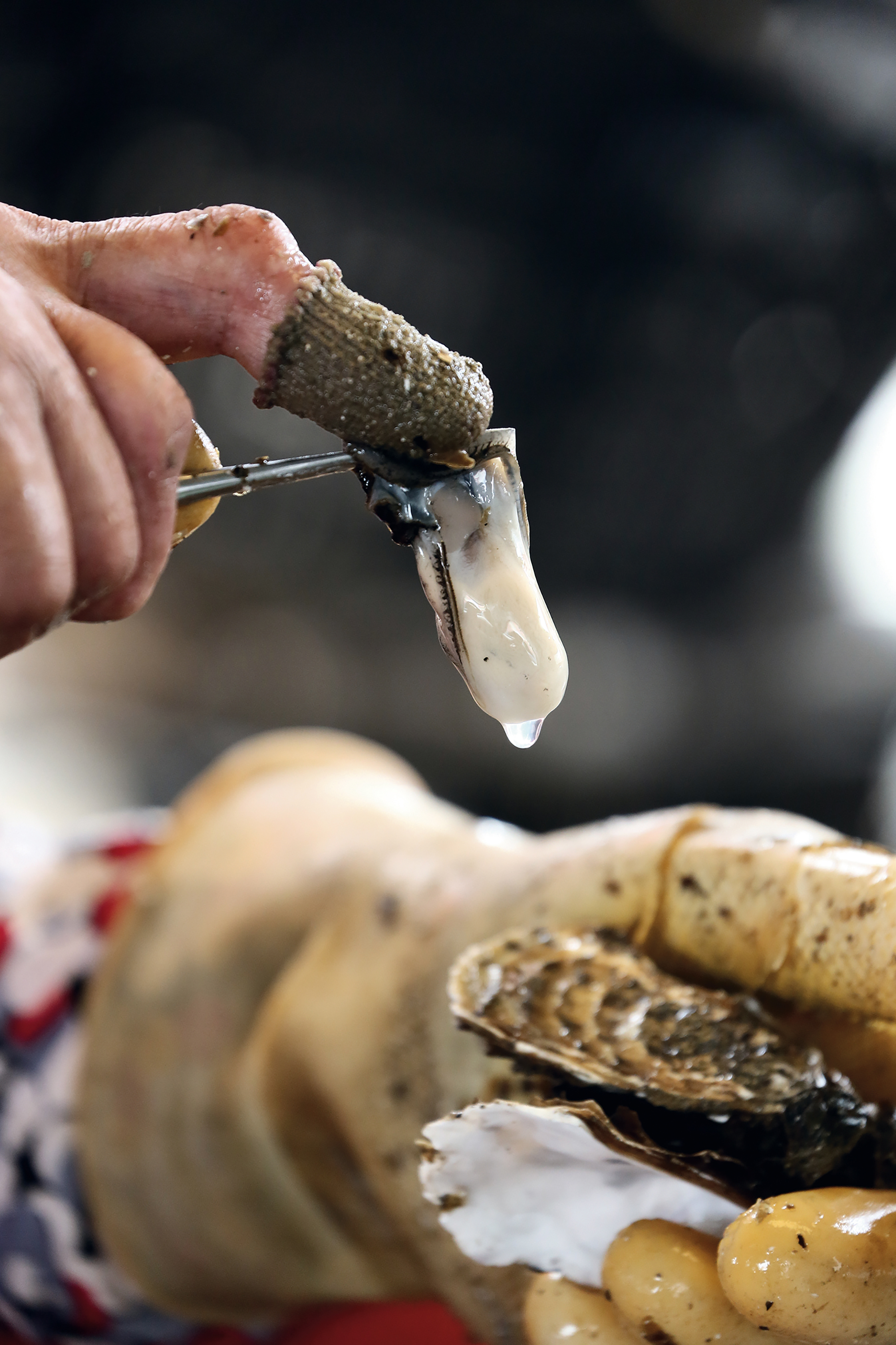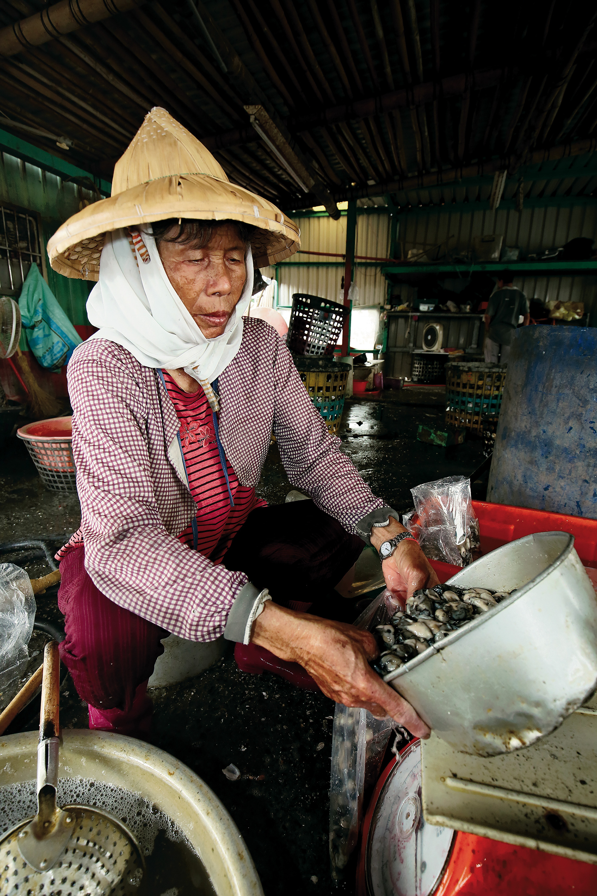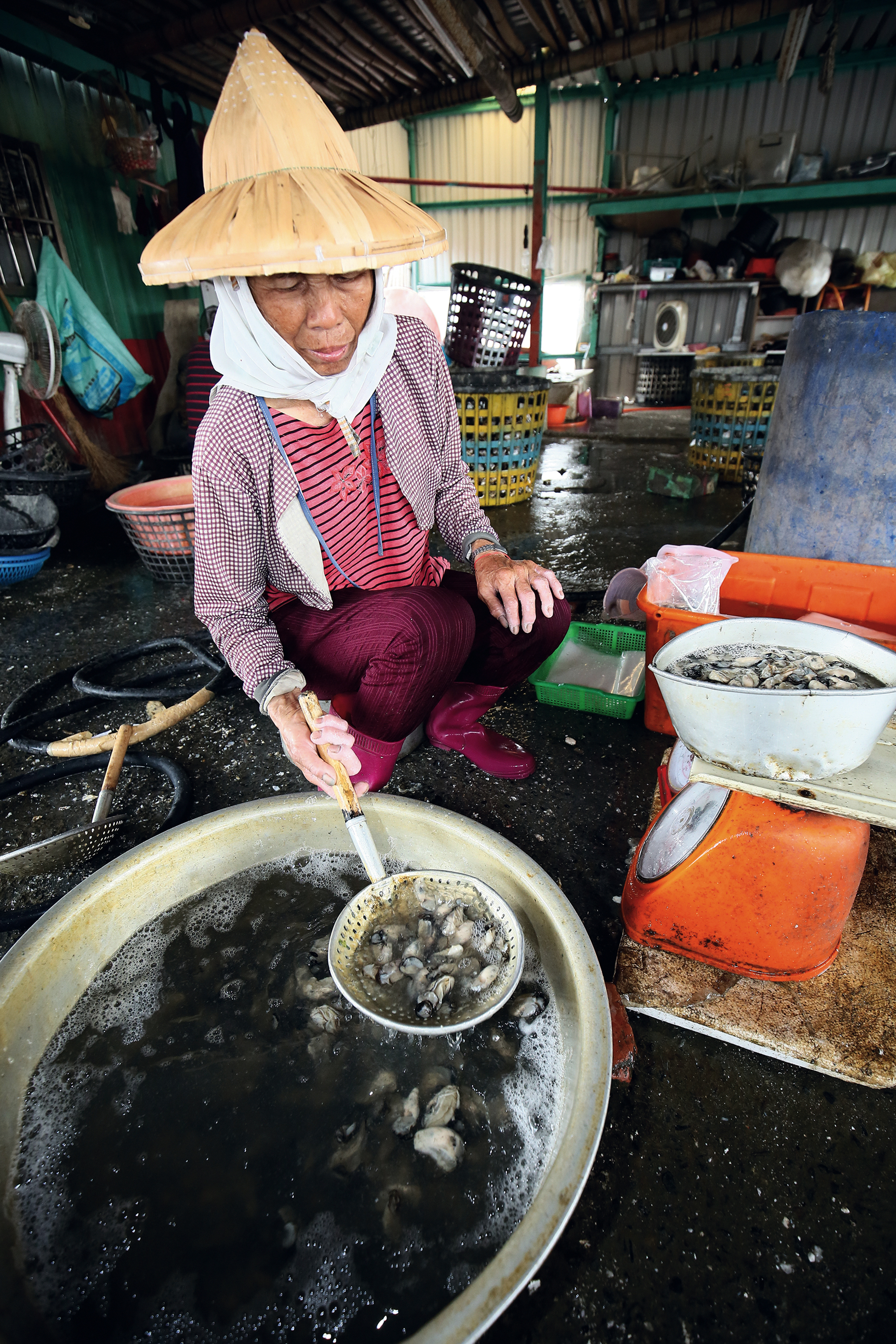 殻から取り出したカキの身は塩水につけて味が落ちるのを防ぐ。(嘉義県東石)