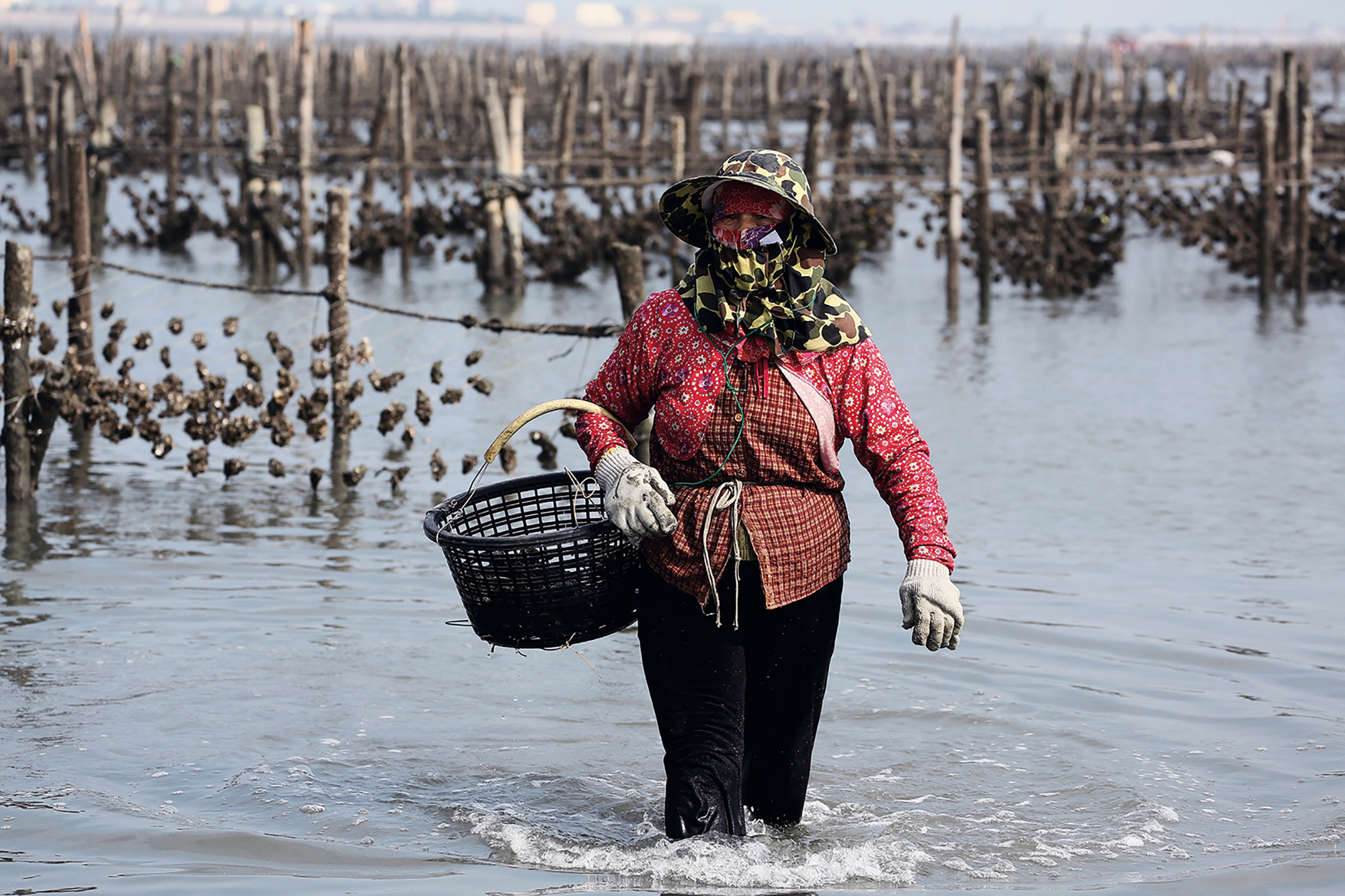 農家が田畑を見回るように、カキ養殖業者もカキ棚を見回る。(彰化県芳苑)