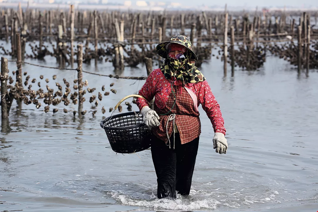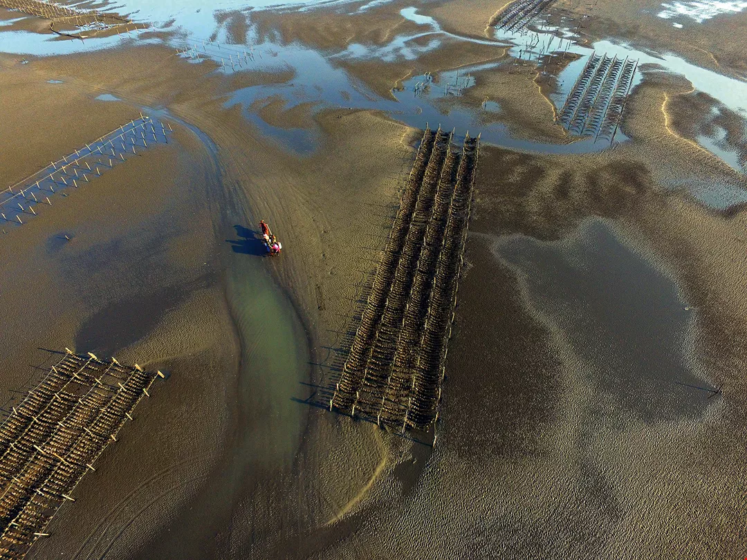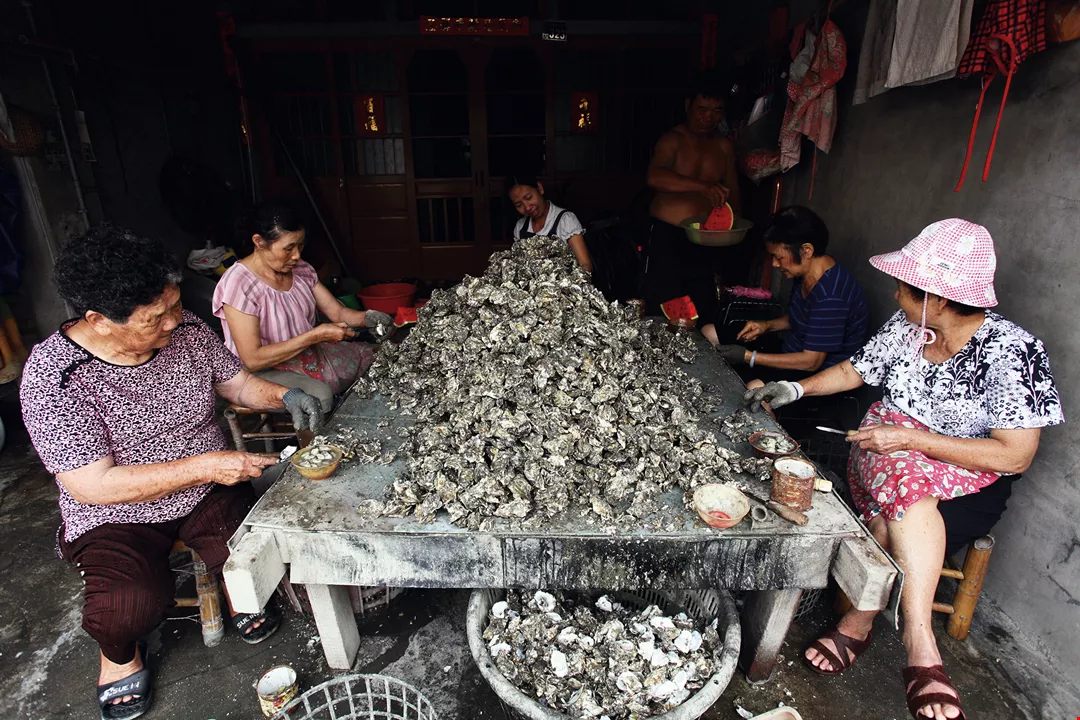 嘉義県東石の沿岸を上空から見下ろすと、海面に無数のカキ棚が広がっているのが見える。台湾西部の沿岸におけるカキ養殖の風景である。養殖をする人々は、引き潮の時にモーター付きの筏でカキ棚の間を縫いながら棚から垂れ下がったカキを収穫していく。陸上では伝統の三合院建築の一角で女性たちがおしゃべりをしながら手際よくカキの殻をむいていく。彼女たちの手には歳月の痕が刻まれている。
