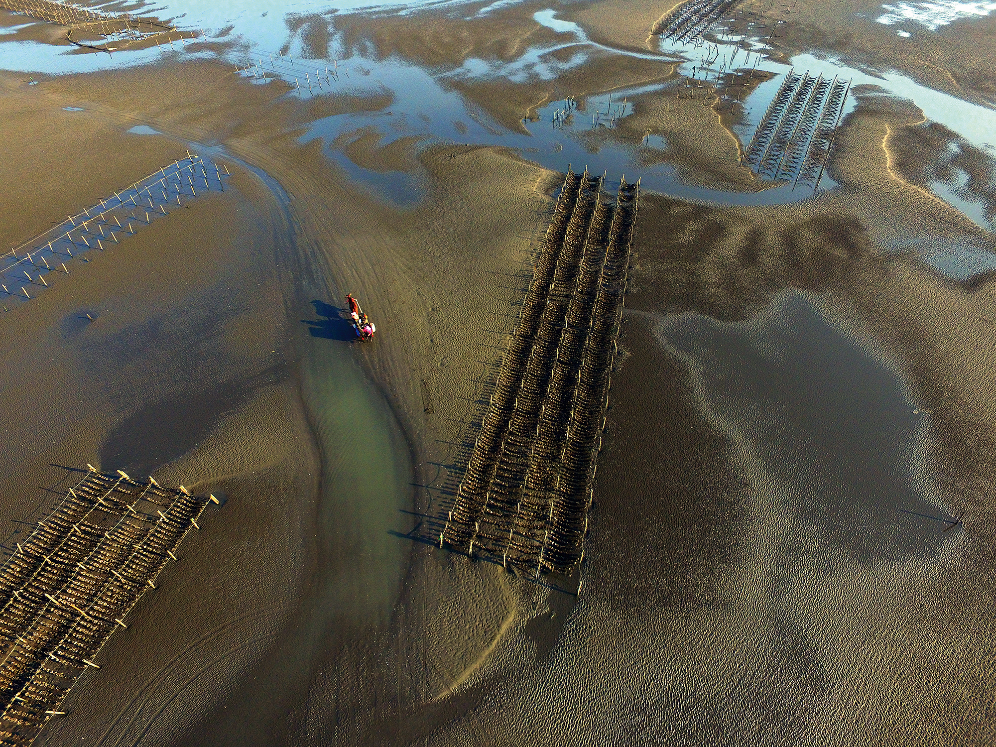 場所を彰化県の芳苑に移すと、こちらでは「海牛がカキ田を耕す」、つまり牛車に乗ってカキ棚の間を移動する伝統的な作業が見られる。陽が西に傾くと、主人の乗った車を引きながら老牛が広大な潮間帯をゆっくりと帰ってくる。こうした光景は、何年か後には記憶にしか残っていないかも知れない。