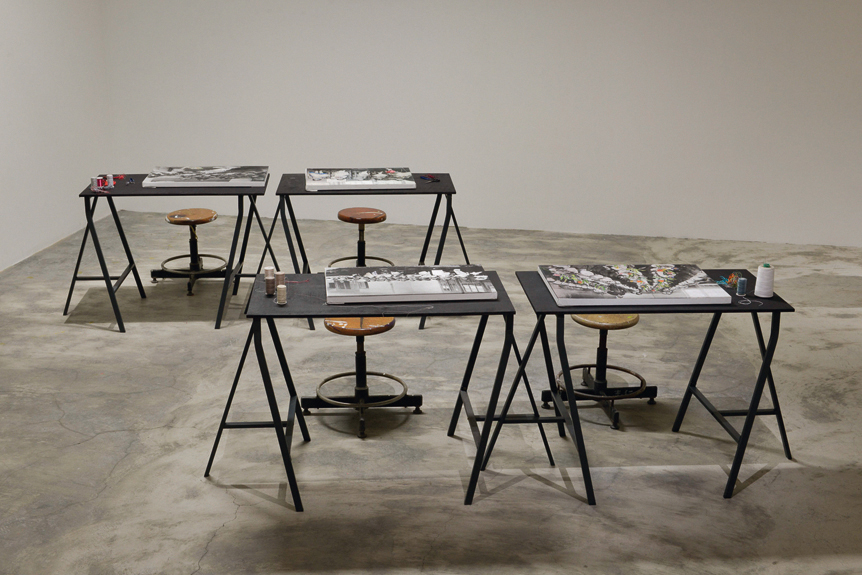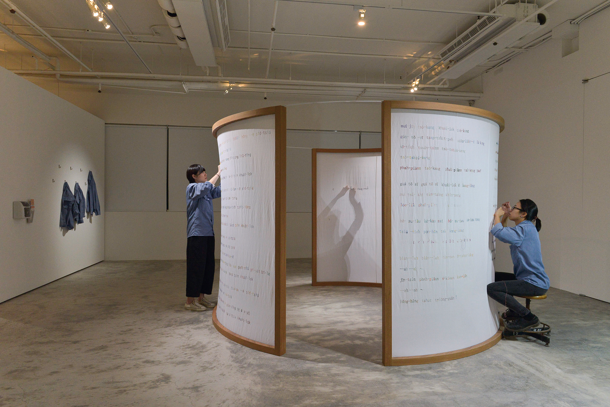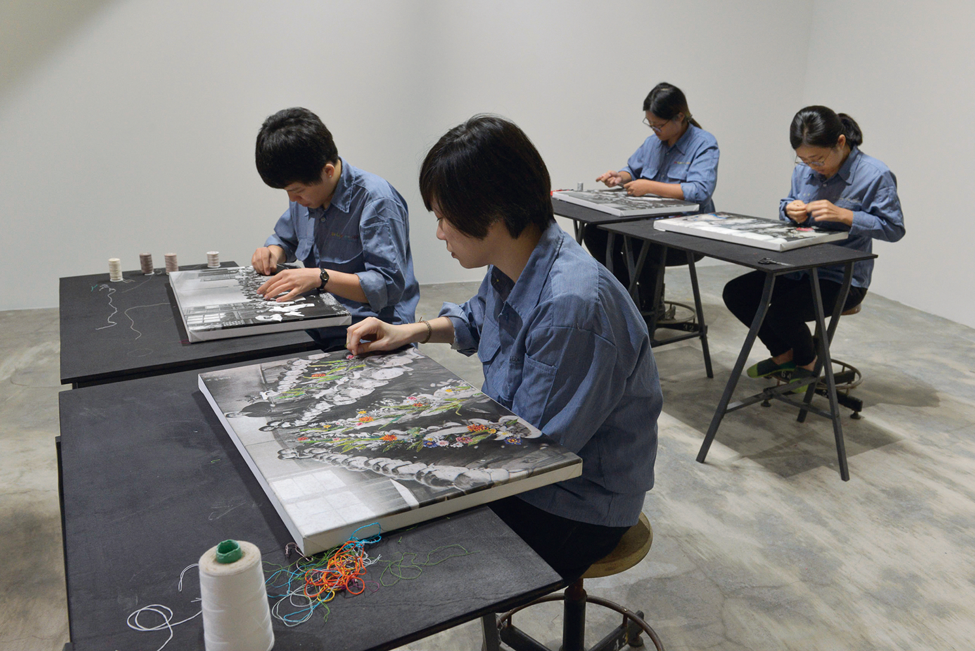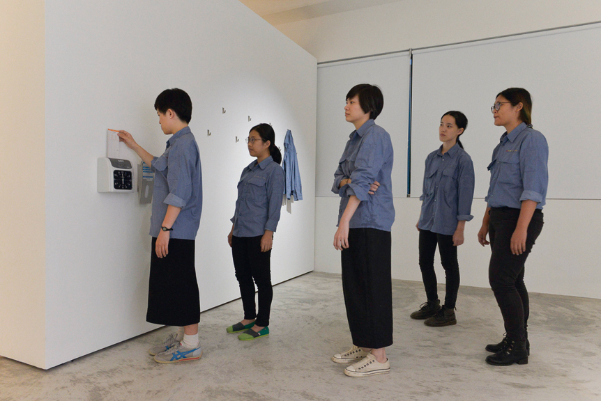 2015年の展覧会『刺繍受託工場』以降、侯怡亭の「刺繍アクション」はかつての『複体』のように覆い隠されたものではなく、展覧会場でその過程を露出するパフォーマンスとなった。作業員がタイムカードを押して刺繍を行なうという勤務形態を見せる。言い換えれば、以前の作品で私たちが目にしたのは完成した刺繍の美だったが、現在は「作品が作られるプロセス」を見せ、そこからさらにアート制作の労働メカニズムに焦点を当てる。これまでアーティストの労働は作品の陰に隠れて注目されることはなかったが、侯怡亭は「現場」での刺繍作業とタイムカードを押す行為を通して、制度批判(インスティテューショナル・クリティーク)を実践している。
