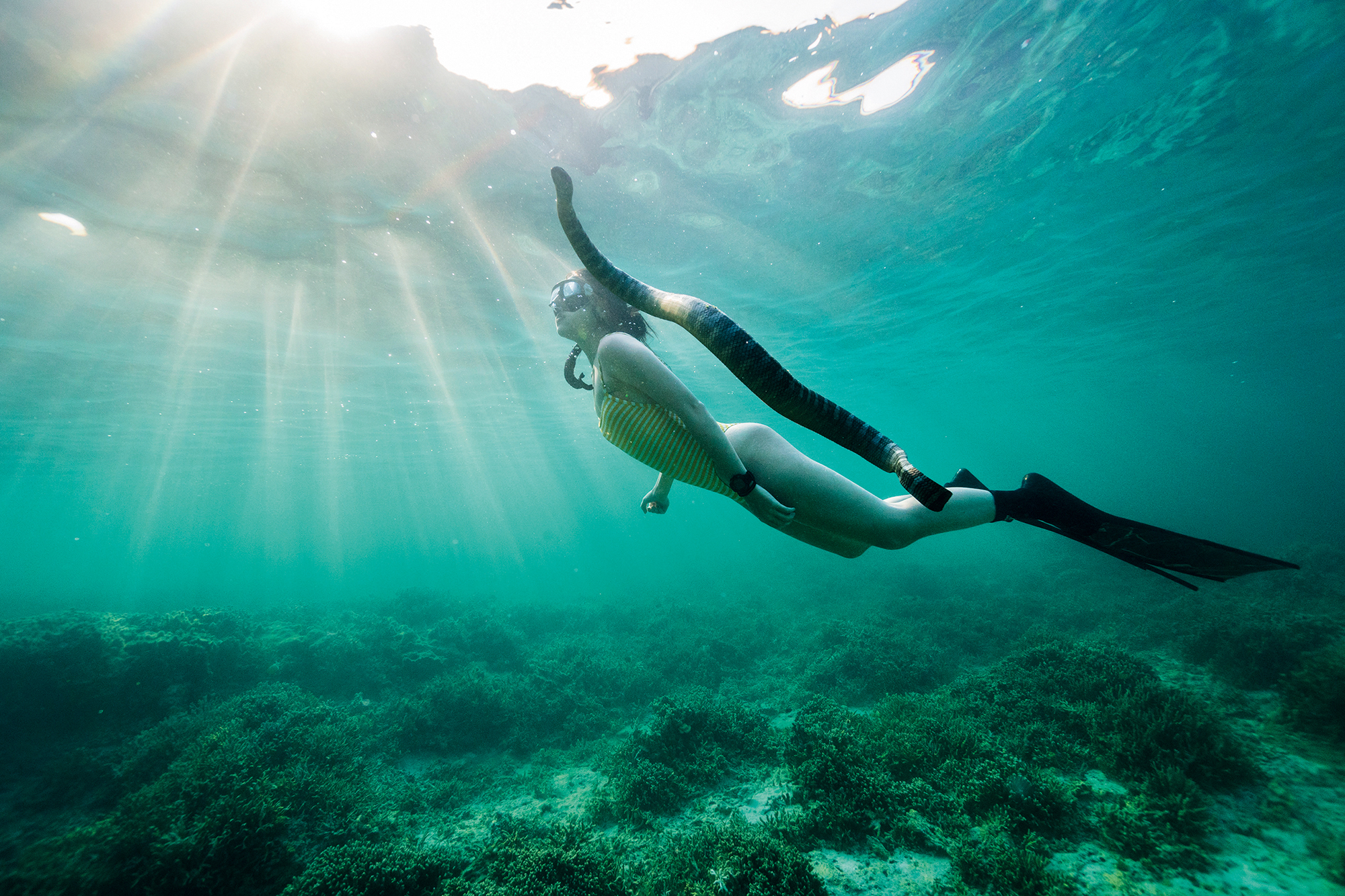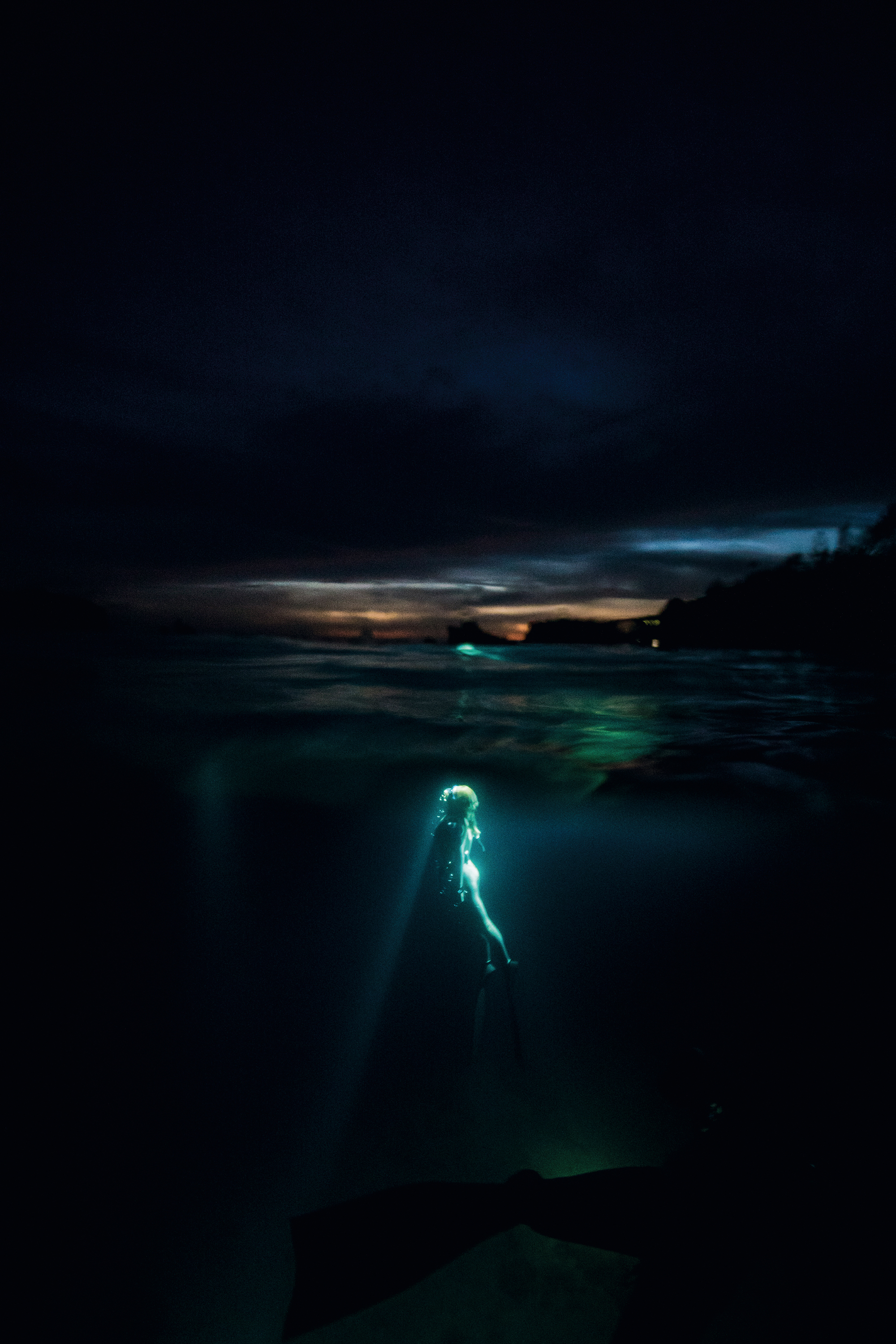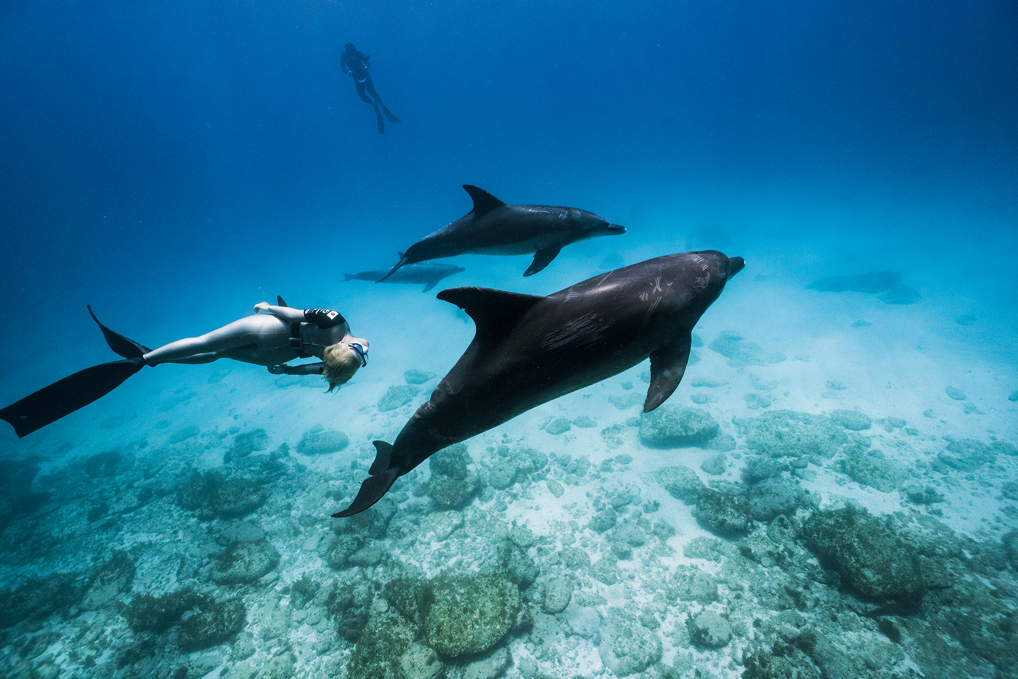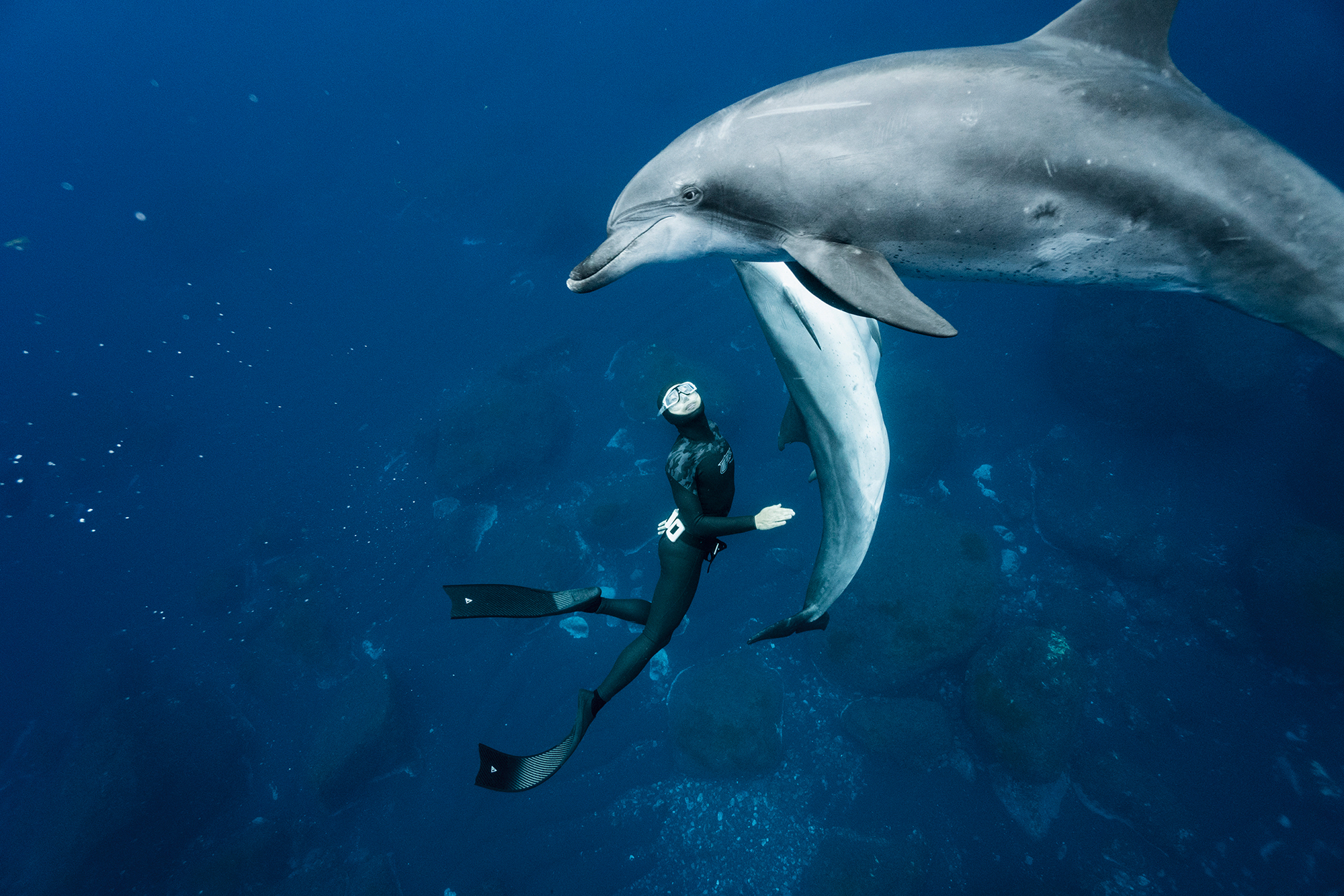 息を大きく吸い込んだだけで潜れるわずかな時間だが、それで水深30メートルまで達することができるとは思いもしなかった。時にはイルカとアイコンタクトをしながら一緒に泳ぐこともある。さらに思いがけないことに、「水」を隔てるか「空気」を隔てるかで、写真にはまったく異なる世界が生まれるのである。